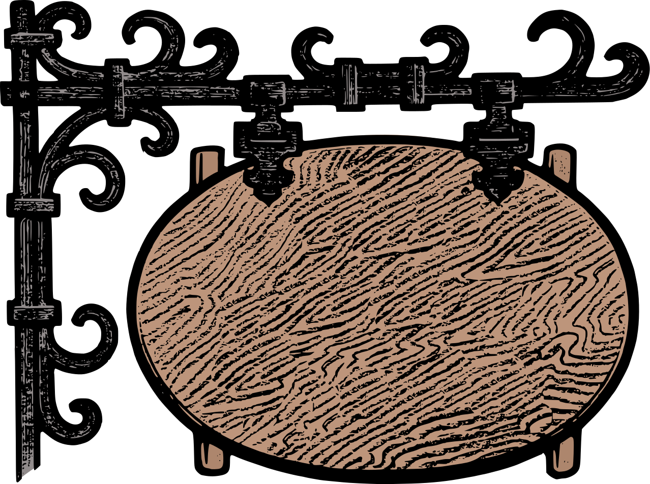 This features a wooden round plate hanging from a metal post. The plate is decorated with an intricate design, giving it an antique appearance. It appears to be a sign or decoration that could be found in a tavern or similar establishment. The metal post supporting the plate adds a touch of elegance and sophistication to the overall presentation.
