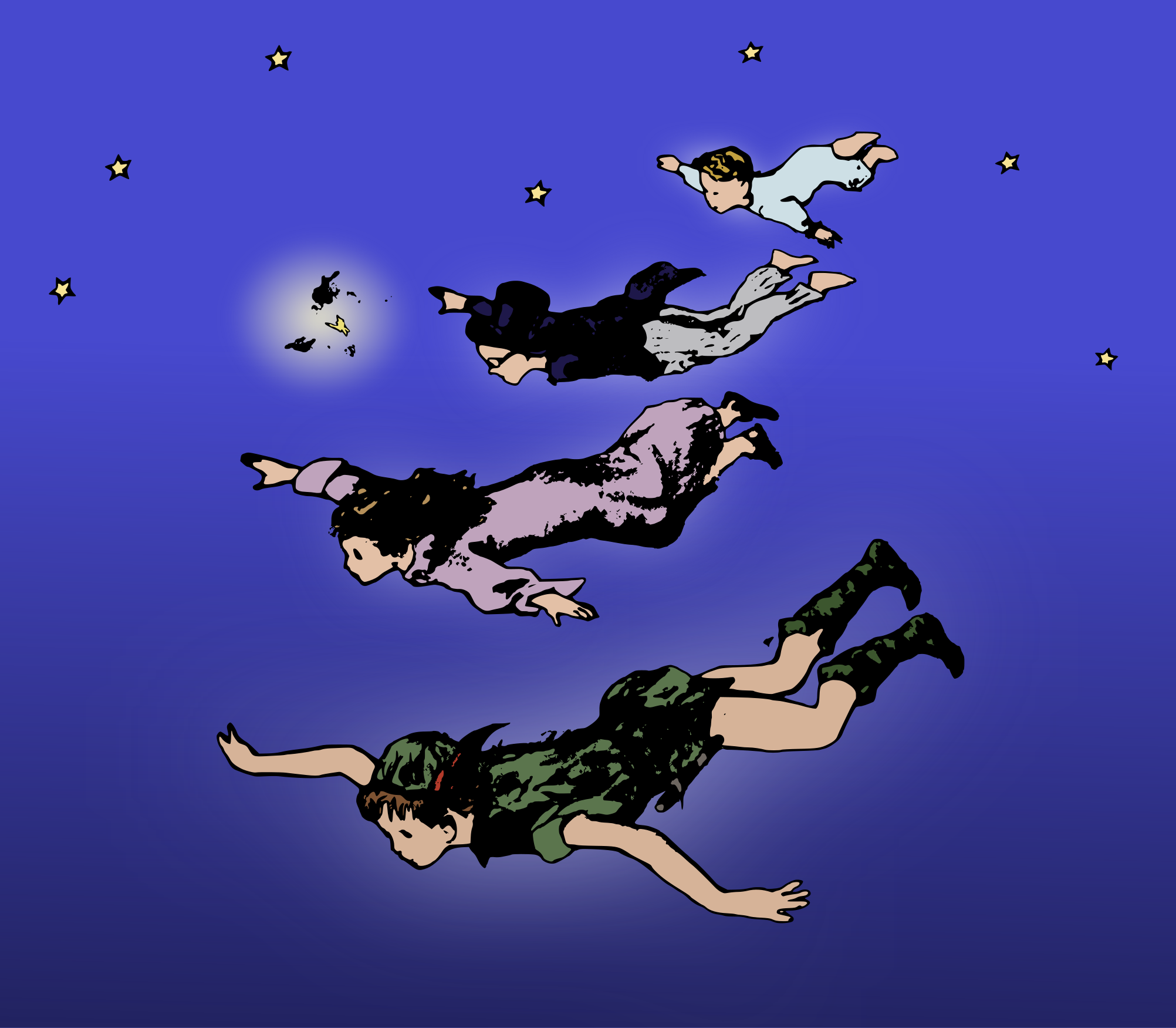 This features a group of four children and a fairy flying through the sky. They are all in mid-air, soaring above the clouds with their arms outstretched. Each child appears to be enjoying the adventure as they fly together. The scene is set against a backdrop of a dark blue sky, which contrasts beautifully with the vibrant colors of the children and fairy. This whimsical illustration captures the essence of freedom and imagination that comes from flying through the air.