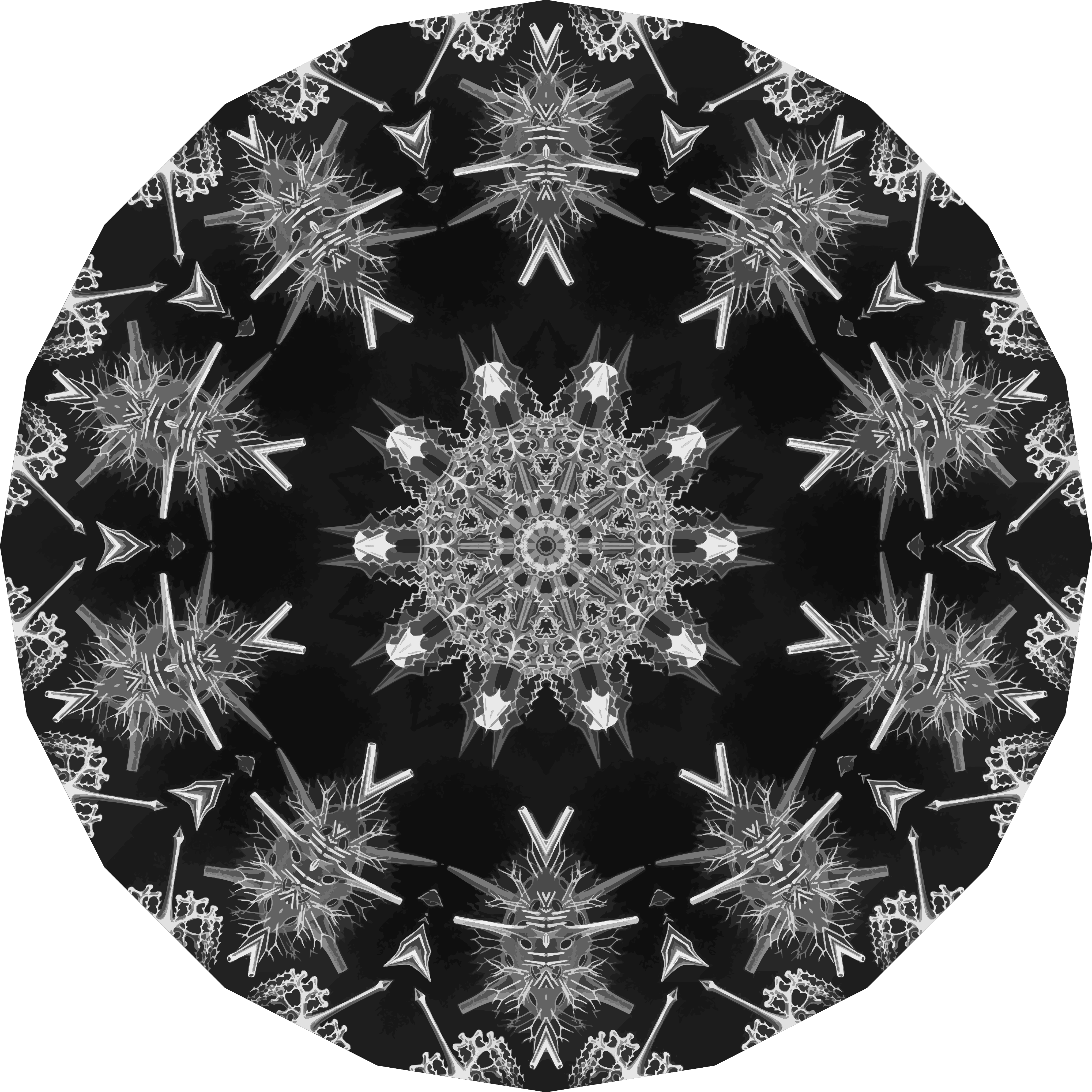 This features a black and white circular design with an intricate pattern of acanthophracta. This design is composed of various shapes, including stars and other geometric forms that are interconnected to create a visually striking composition. The overall effect is a captivating and complex pattern that showcases the artist's skill in creating a harmonious yet diverse arrangement of shapes. The black and white color scheme adds an element of contrast and depth to the design, making it stand out as a unique piece of art or decoration.