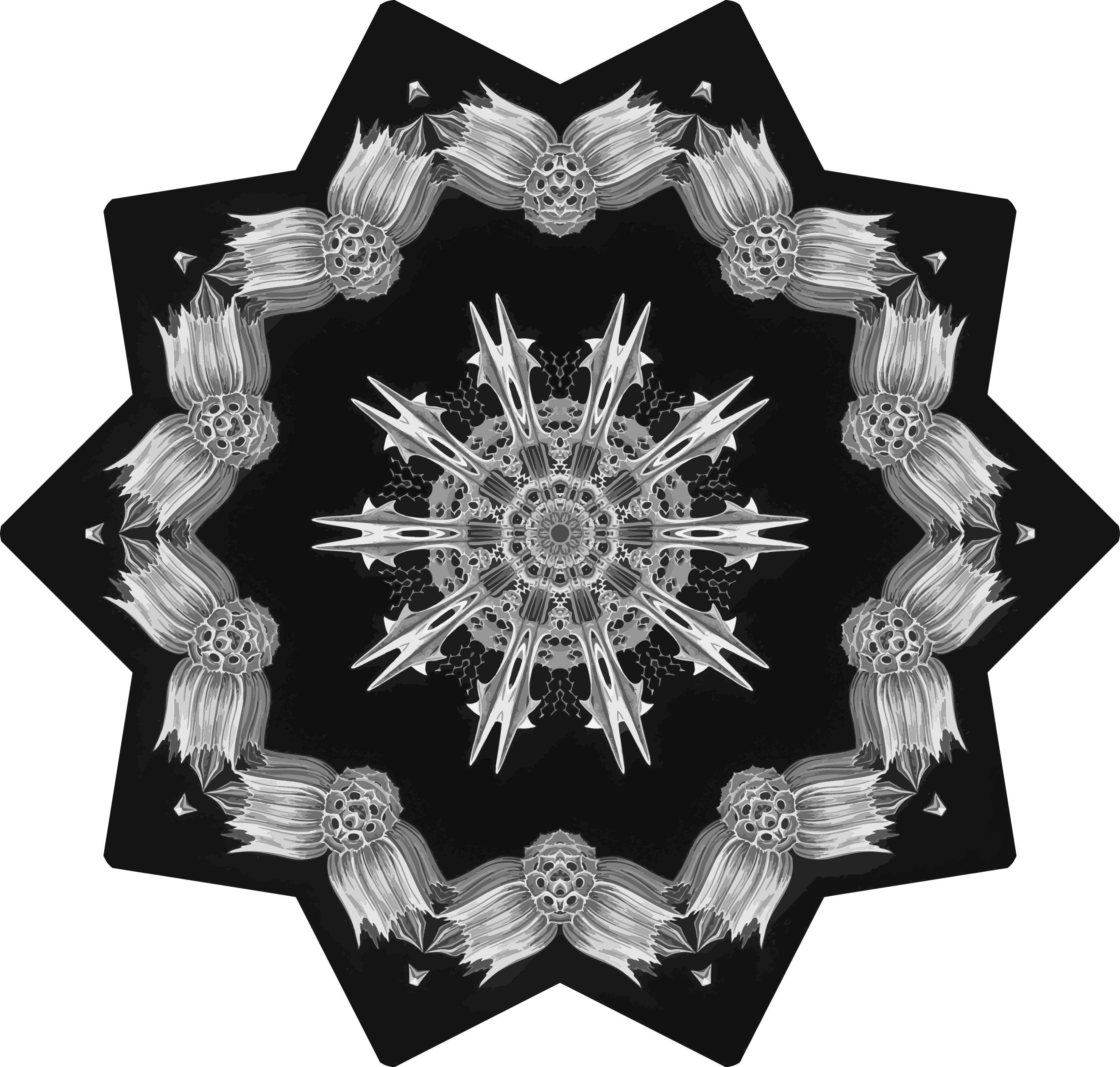 This features a black and white design that resembles an ornate star pattern. The star is composed of multiple points, creating a visually striking appearance. The design has a mirror effect, giving it depth and dimension. The overall composition of the image showcases intricate details and patterns, making it an interesting visual piece.