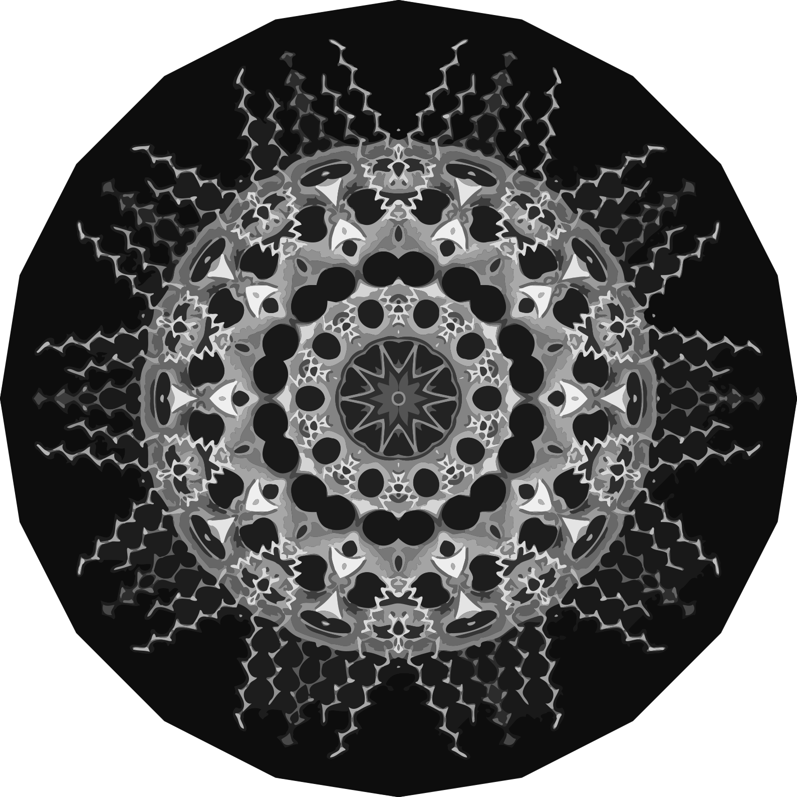 This features a black and white circular design with an intricate pattern. This pattern is reminiscent of a star, giving the impression that it could be a celestial or astronomical theme. The circle itself has a unique acanthophracta pattern, which adds to its visual appeal. The overall composition creates a captivating and visually striking image.