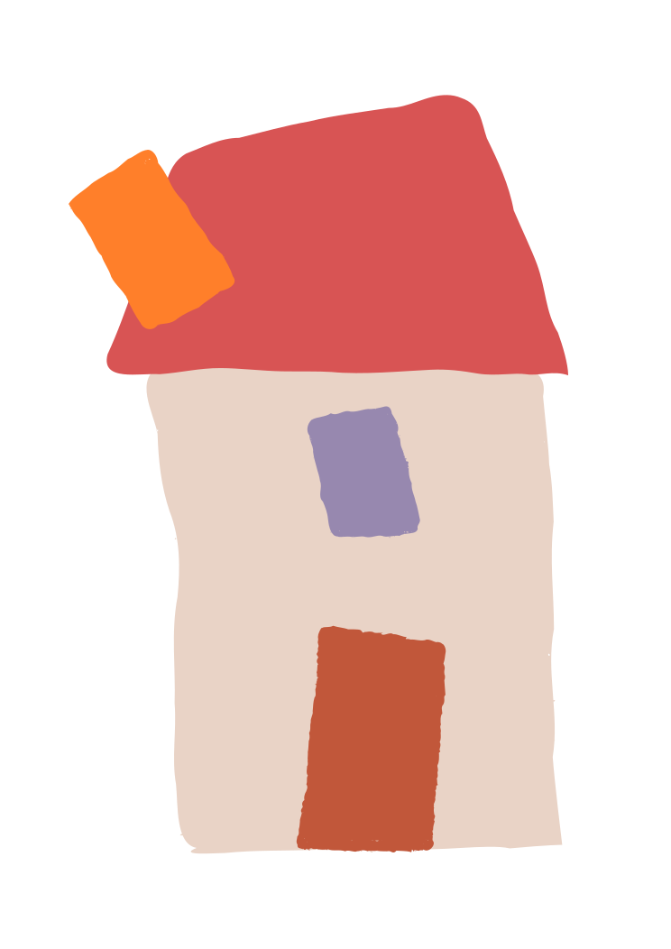 This features a colorful house with an orange roof and red walls. It has a crooked appearance, giving it a unique charm. The house is adorned with two windows, one purple and the other blue, adding to its vibrant colors. A door can be seen on the side of the house, further enhancing its distinctive character. This artistic representation of a house showcases creativity and imagination through its unconventional design elements.