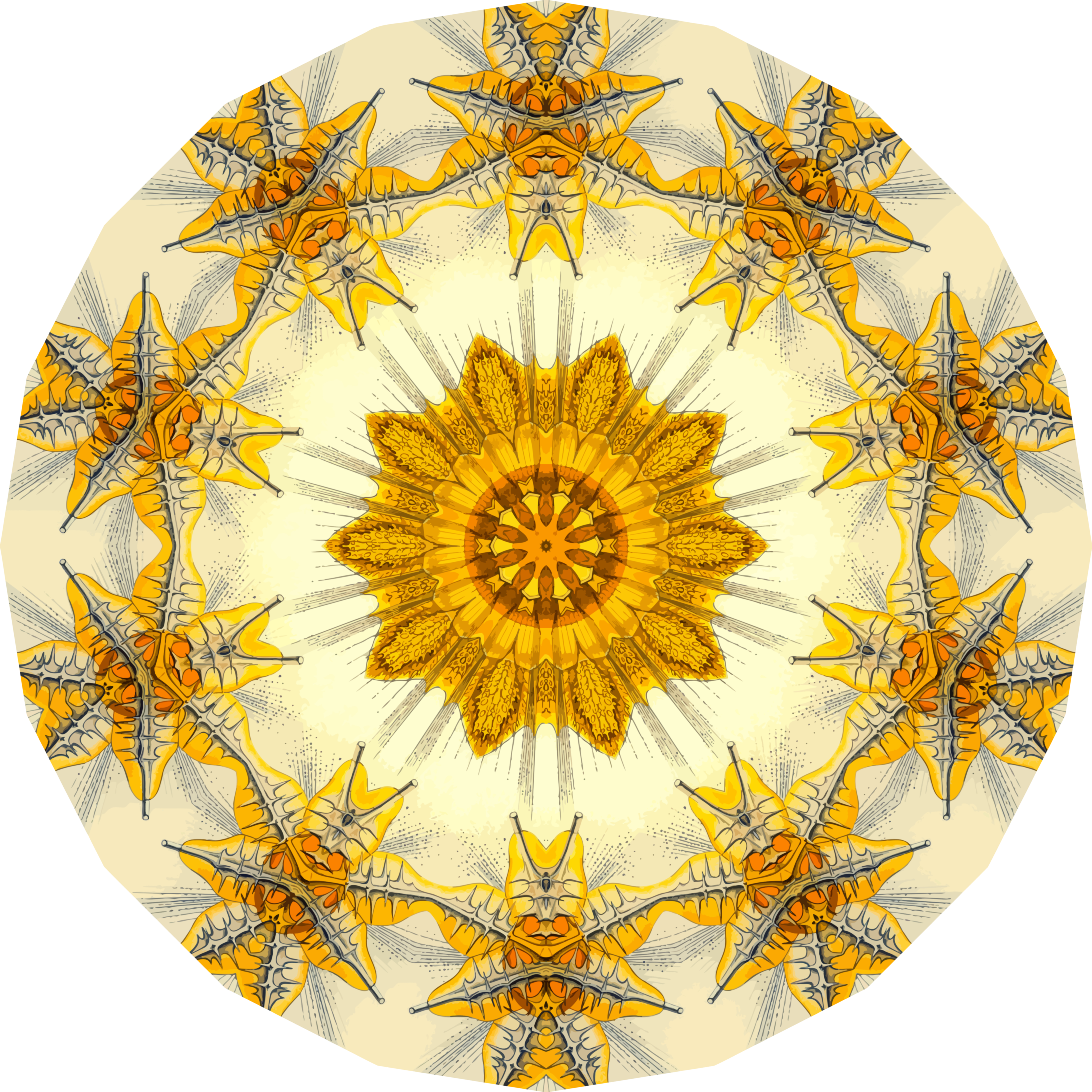 This features a circular design with an abstract flower in the center. The design is made up of various shapes and patterns, creating a visually appealing composition. The central flower appears to be yellow, surrounded by other shapes that contribute to the overall artistic effect. This unique pattern can be found on various surfaces or used as a decorative element for home décor.