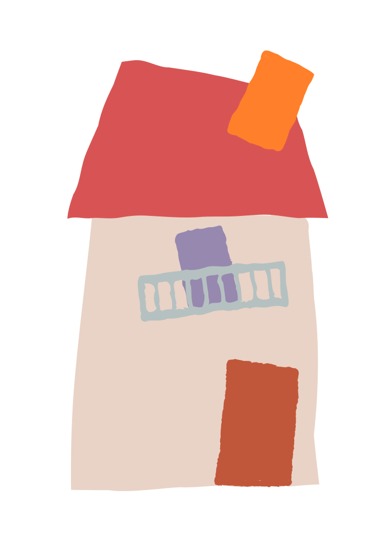 This features a colorful house with an orange roof and red chimney. It has a crooked door on the second story, adding to its unique appearance. The house is also adorned with a balcony that complements the overall design of the structure. This artistic representation of a house showcases creativity in its depiction, making it an interesting visual piece.