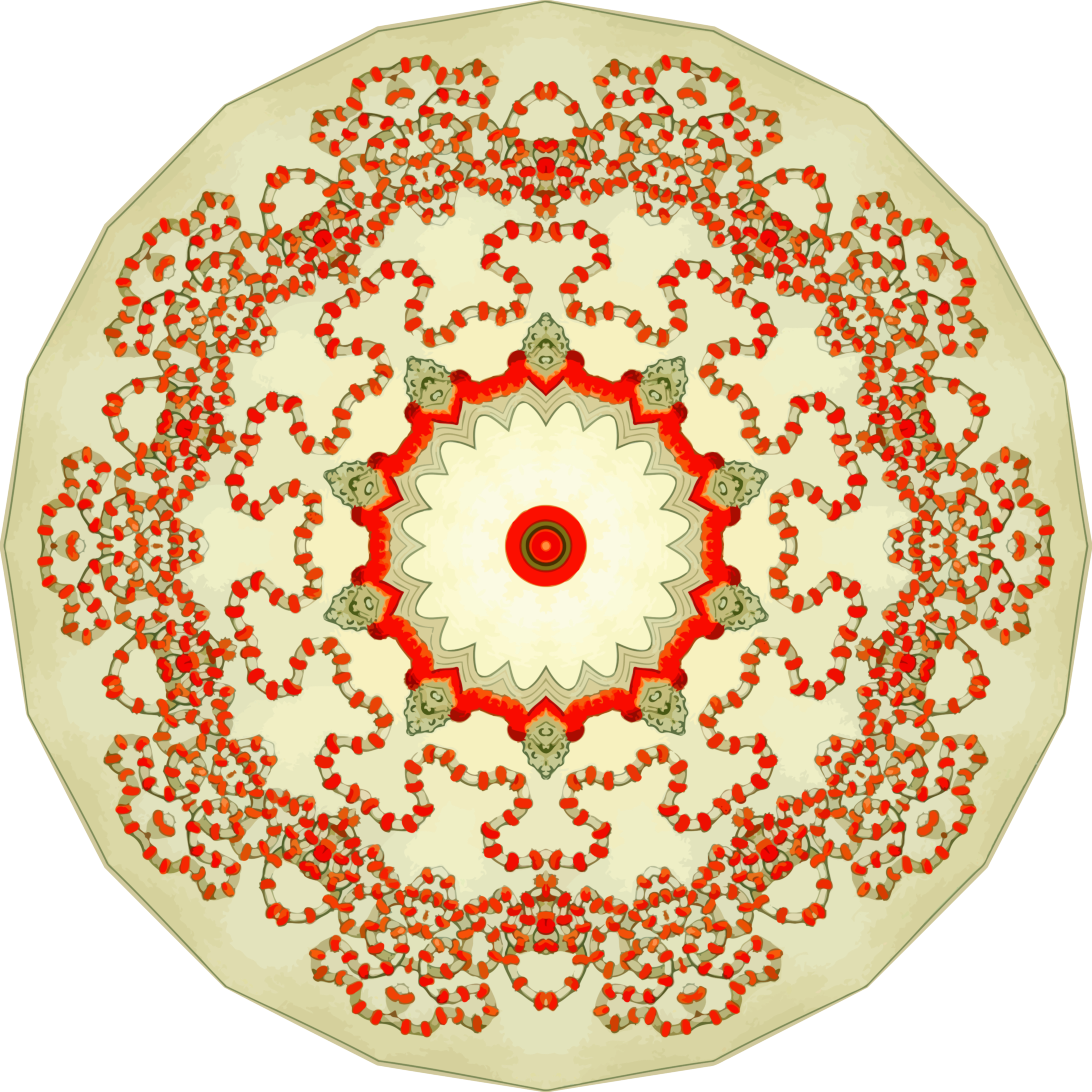 This features a large, intricate design that resembles an ornate piece of art. It is composed of many small circles arranged in a circular pattern, with each circle containing a different color and design element. The overall effect creates a visually striking and complex pattern that draws the viewer's attention. This type of design could be used for various purposes such as wallpaper, fabric patterns or even as an artistic piece to adorn a space.