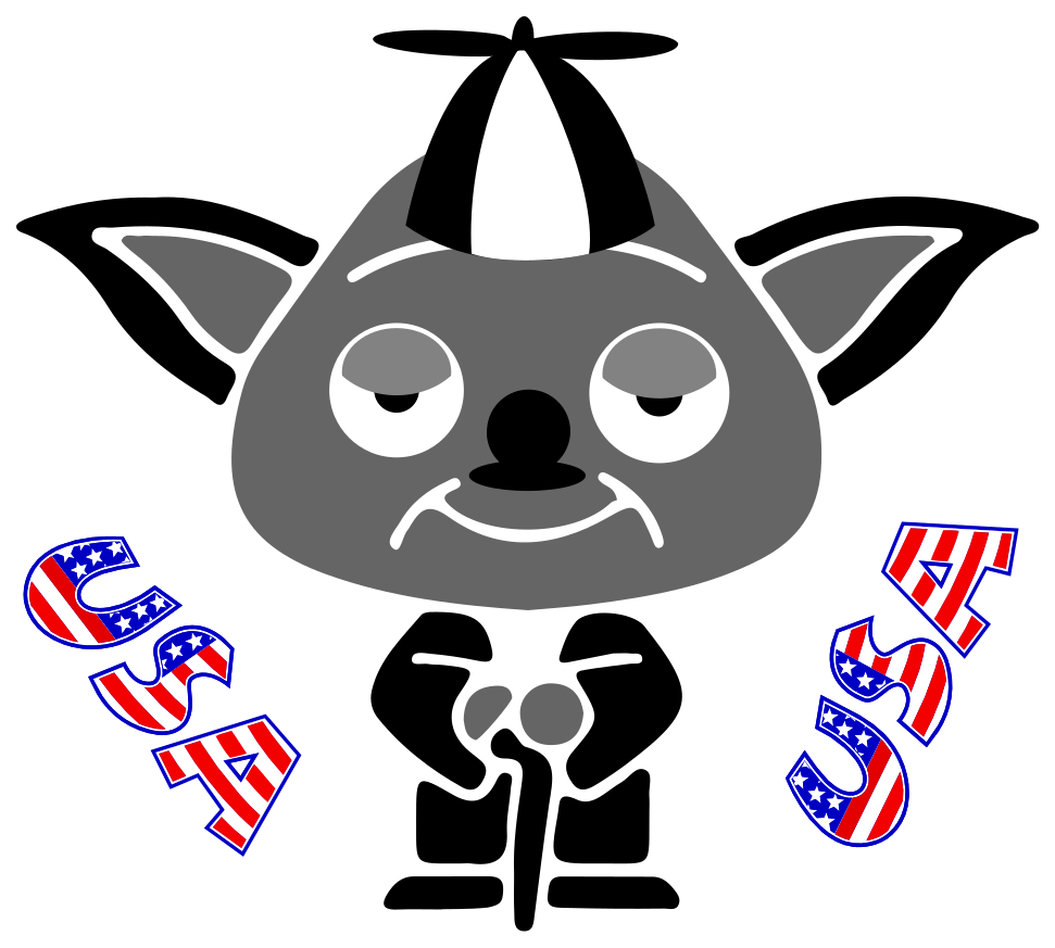 This features a cartoon animal, possibly an elephant or a monkey, wearing a hat and holding a cane. It is dressed in a suit and appears to be standing on one leg while looking at the camera. The animal has two pointy ears and is adorned with letters "USA" written by it, which are made of American flags. This whimsical character seems to be a unique and creative representation of the United States.