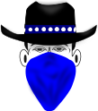 This features a cowboy's face with a blue bandanna covering most of it, except for his eyes. He is wearing a black cowboy hat on top of his head. This illustration gives the impression that the cowboy is looking at something or someone off-camera. The blue color of the bandanna adds a touch of contrast to the overall image, making it stand out against the background.
