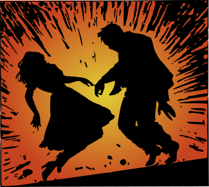This features a man and woman standing in front of an orange and yellow blast. They are both dressed in black, which adds to the dramatic effect of the scene. The woman is positioned slightly behind the man, with her arms outstretched as if she's dancing or performing some kind of movement. The man appears to be reaching for something, possibly trying to grab the woman's hand or engage in a playful interaction. The overall atmosphere suggests an artistic and dynamic moment captured between these two individuals.