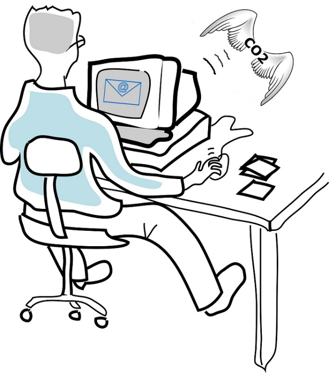 This depicts a man sitting in front of a computer at a desk. Behind the computer, there is a logo that shows Co2 emissions coming out of the computer. This suggests that the man might be working on an environmentally friendly project or simply using his computer to raise awareness about carbon emissions. The scene also includes a keyboard and mouse placed in front of the man, indicating that he is actively engaged with the computer.