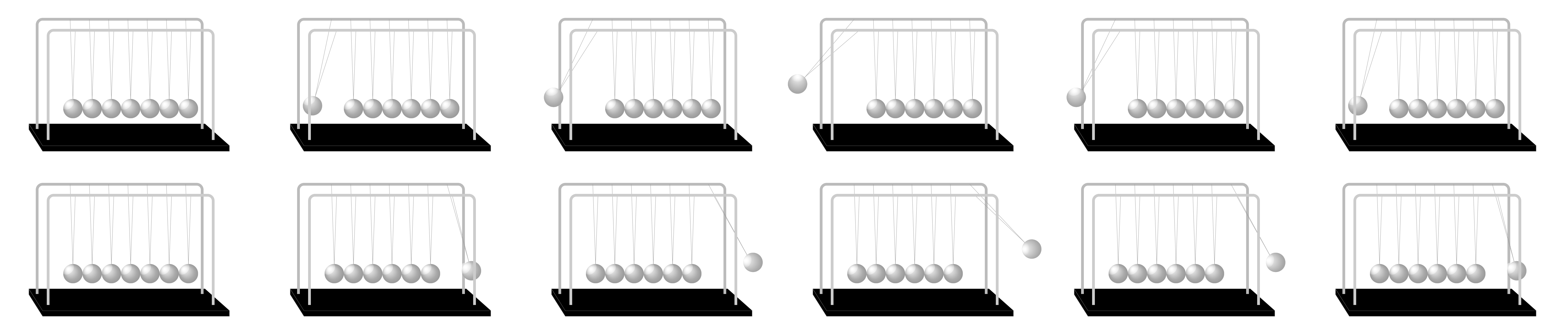 This features a collection of twelve Newton's cradles, each in various stages of motion. These cradles are designed to demonstrate the concept of conservation of energy through the transfer of energy from one object to another. Each cradle is placed next to each other, creating an organized and visually appealing display. The arrangement showcases the different states of motion that these cradles can exhibit when subjected to a swinging or tapping action. This image serves as an educational tool for demonstrating the principles of physics in a simple yet engaging manner.