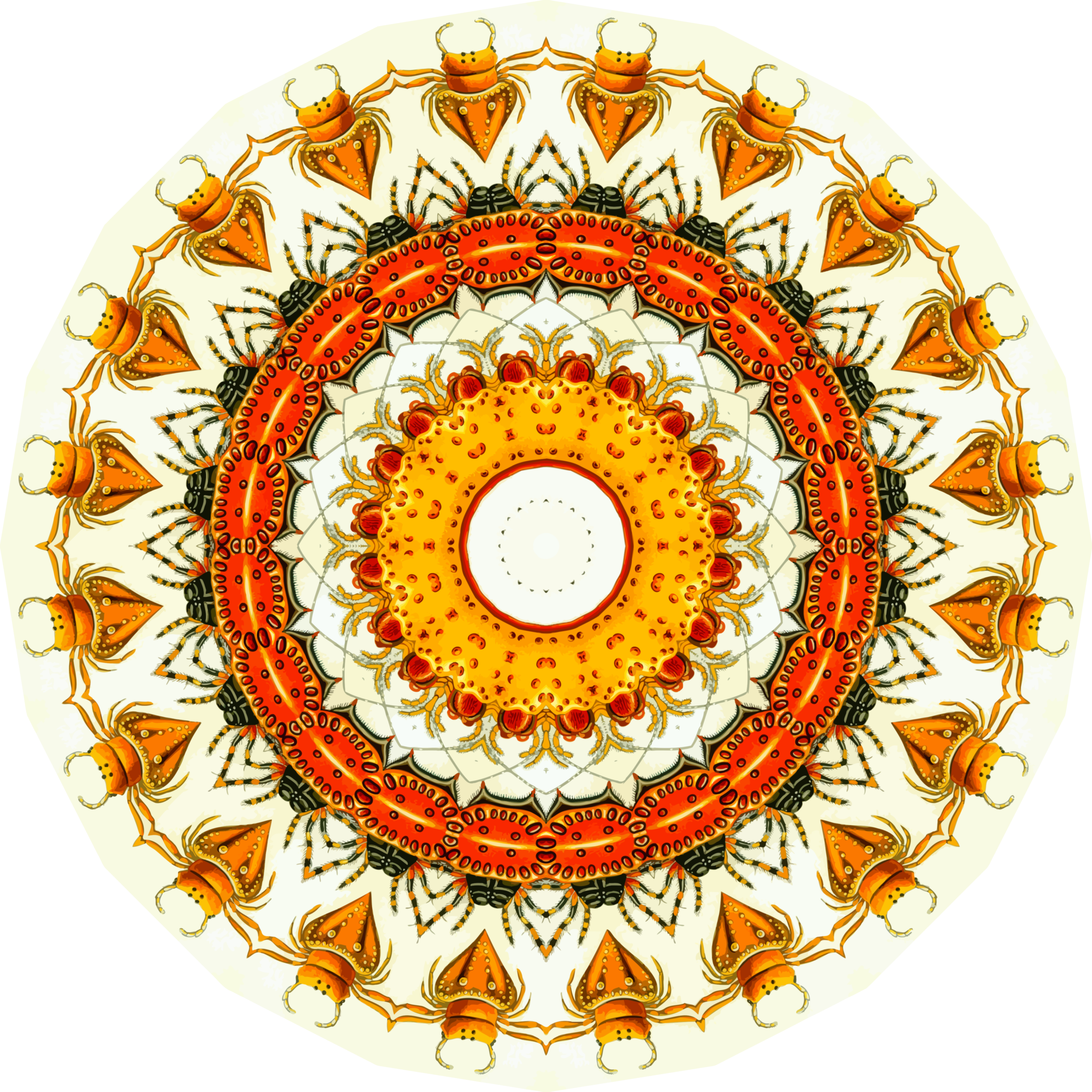 This features a large, round design with an orange background and a white center. This central circle is surrounded by various other circles of different sizes, creating a visually appealing pattern. The design also includes several red bugs or insects scattered throughout the scene, adding to its vibrant and intricate appearance. Overall, it's a captivating piece that showcases creativity and attention to detail in its composition.