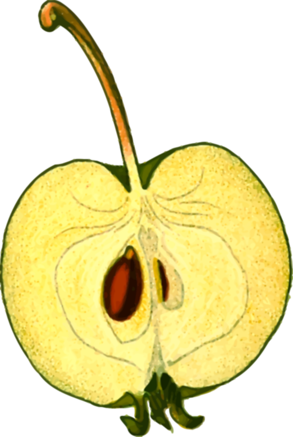 This features a yellow apple with a brown stem, which is cut in half. It appears to be an illustration or drawing of the fruit rather than a real one. The apple has a unique shape and is presented in a close-up view, allowing for detailed observation of its texture and color. The artist's skillful depiction of the apple showcases its natural beauty and highlights the contrast between the yellow skin and brown stem.