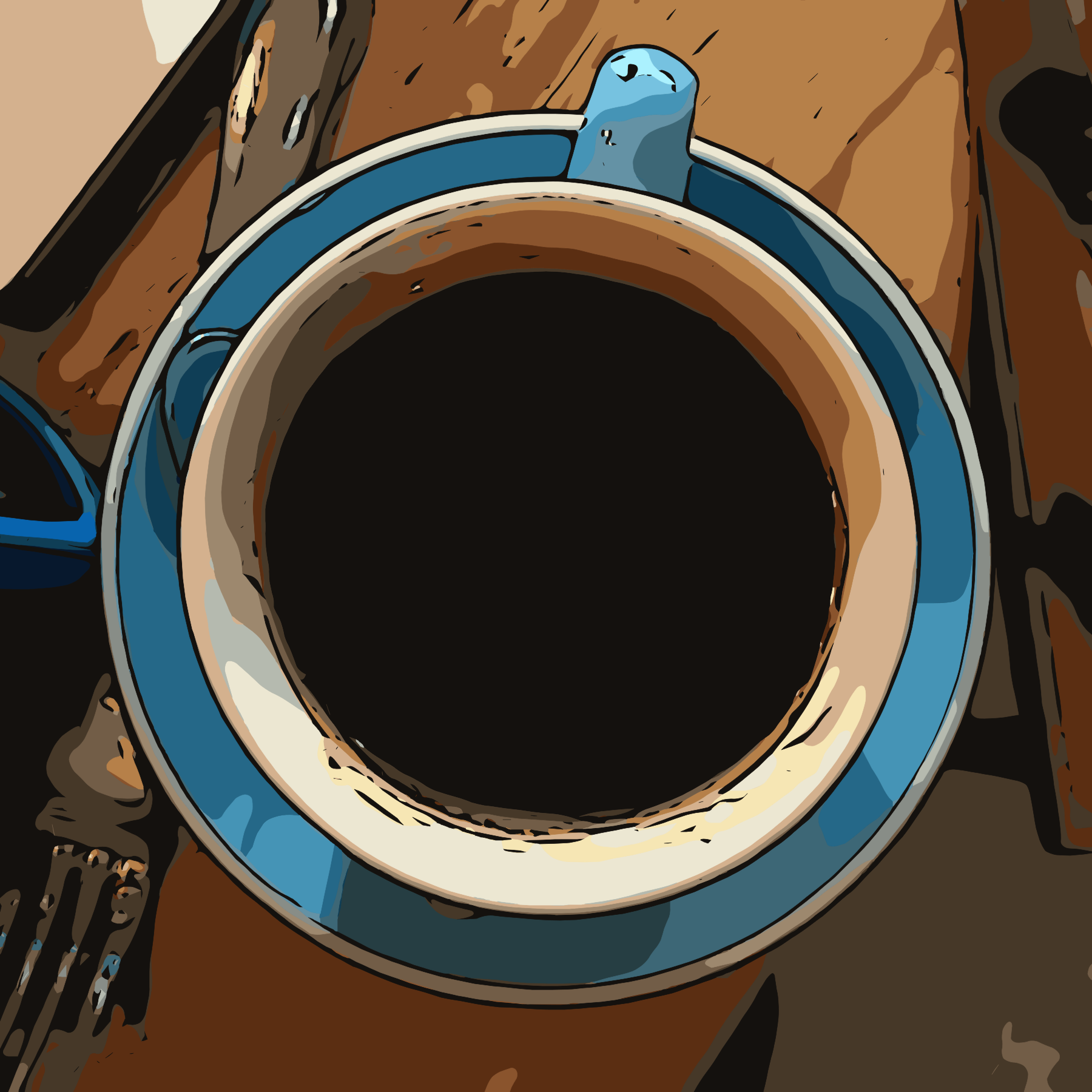 This features a blue coffee cup with a black liquid inside, possibly coffee. The cup is placed on a blue platter and has a handle for easy gripping. The cup appears to be empty or nearly so, as the contents are visible through the side of the cup. The color scheme of the cup and its surroundings gives it an artistic appearance, making it stand out from typical coffee cups.