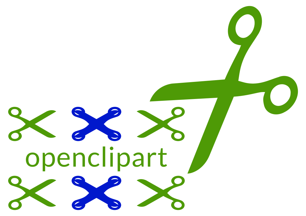 This features a logo for Openclipart, which is an online library of free clip art. The logo consists of two pairs of scissors, one green and the other blue, with the word "Openclipart" written in between them. The scissors are positioned on top of each other, creating a visually appealing design for the logo. This unique symbol effectively represents the concept of open access to clip art resources that Openclipart offers.