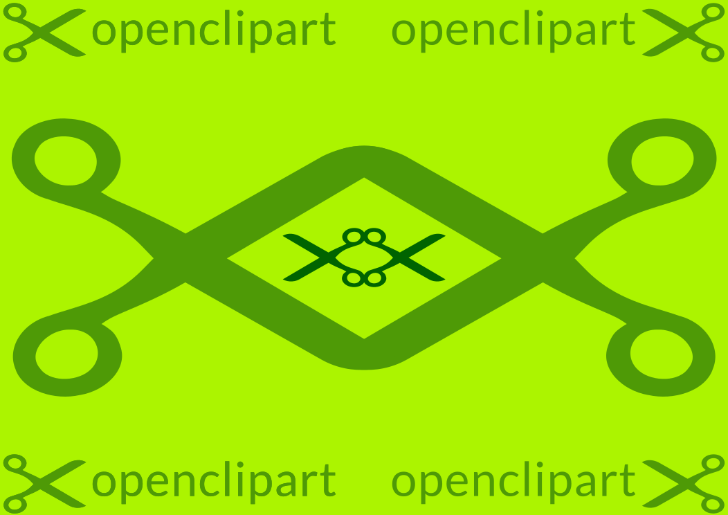 This is a green and yellow graphic featuring scissors in each corner. In the center of the picture, there are two large pairs of scissors facing one another with smaller pairs of scissors inside them, facing away from each other. The word "openclipart" is written on the image four times, indicating that it may be a logo or promotional material for an open source art library.