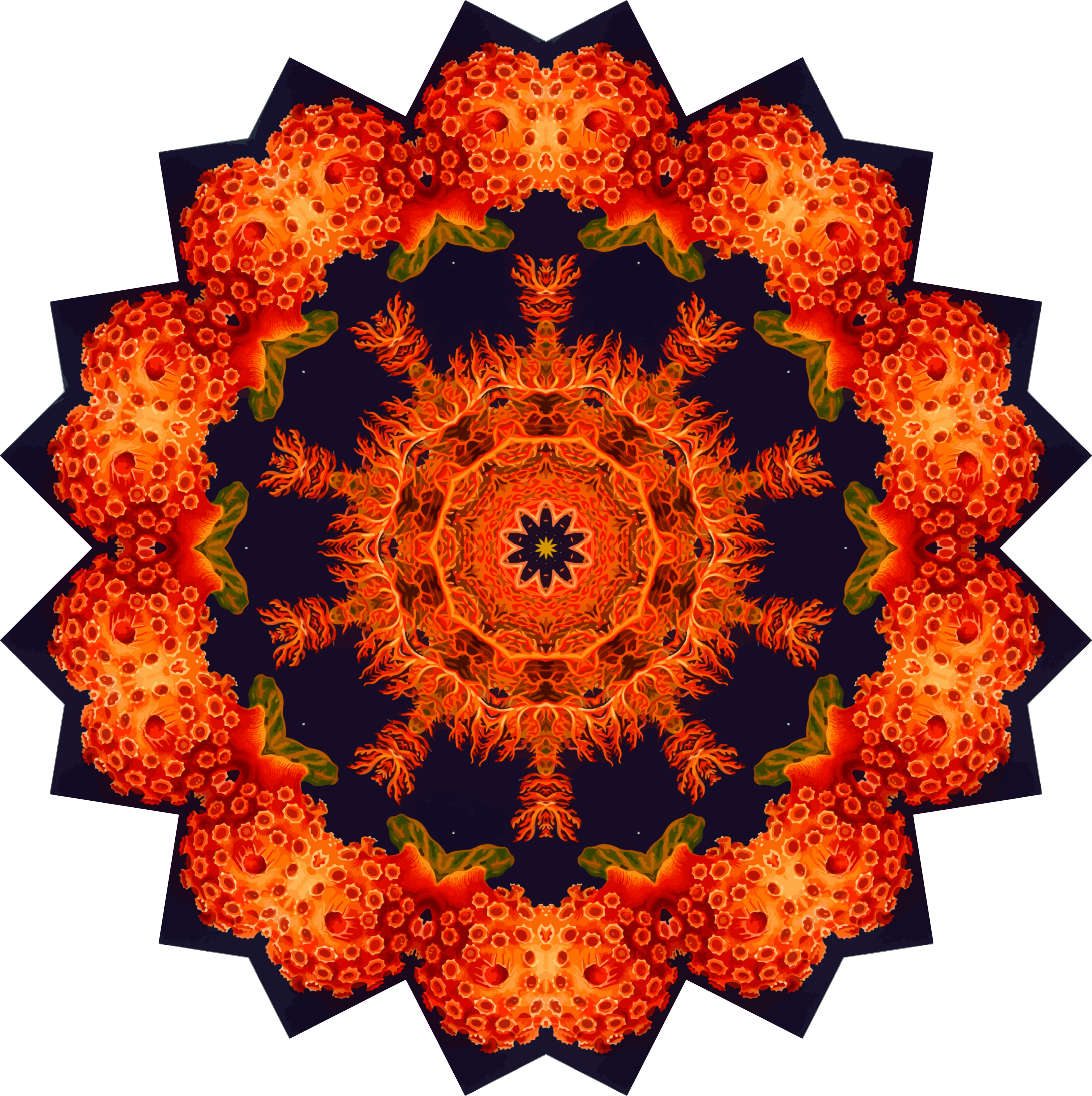 This features a large, intricate design that resembles an orange flower with a fiery colored pattern inside of it. This artistic piece is composed of many small circles and shapes arranged in a circular fashion, creating a visually striking composition. The vibrant colors and detailed patterns make the design stand out as a unique and captivating piece of artwork.