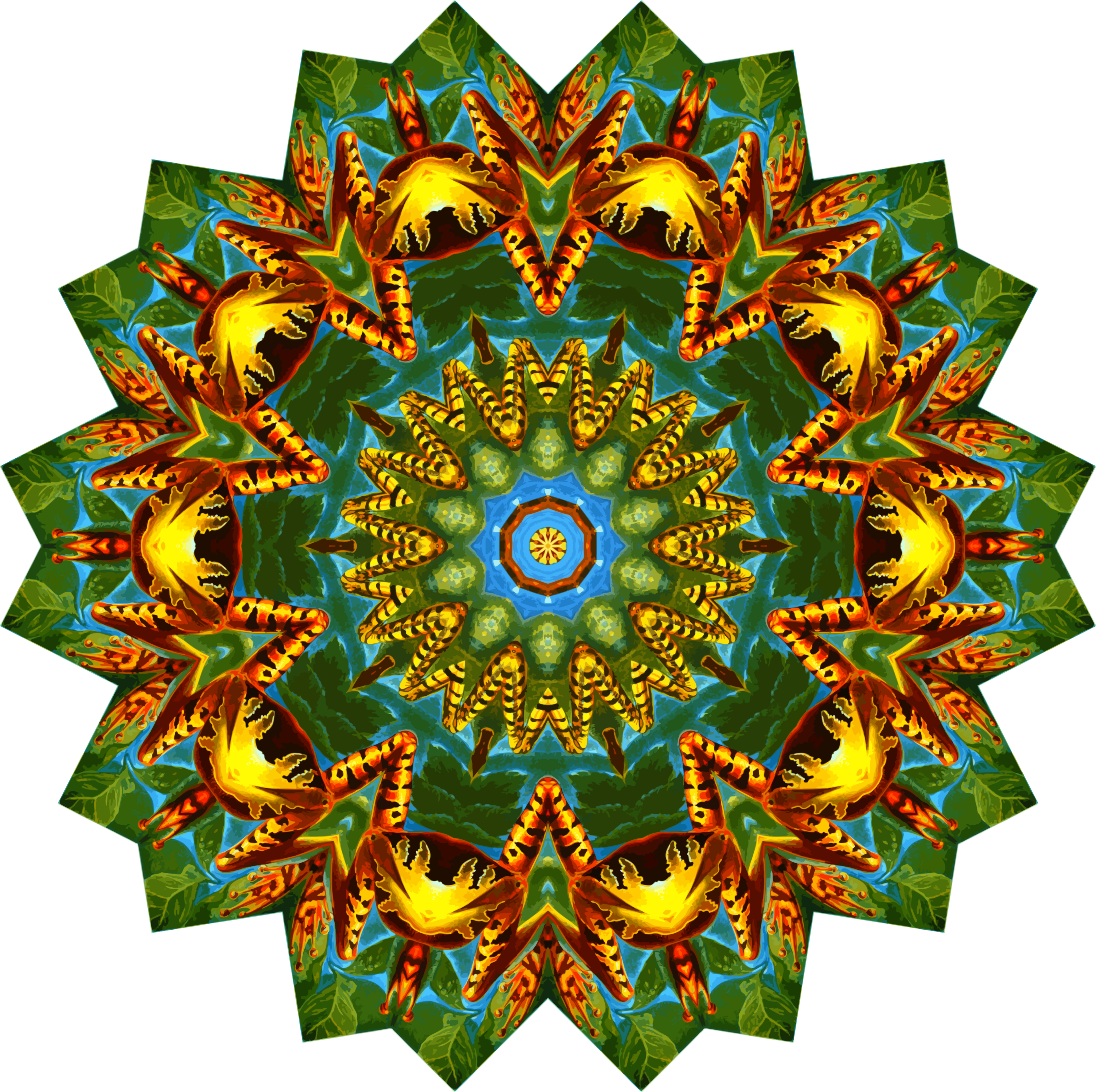This features a large, colorful, and intricately designed circular pattern. This artistic piece is composed of various shapes and colors, including green leaves, yellow flowers, and orange and blue accents. The design resembles a mandala or a kaleidoscope, with the different elements intertwined to create a visually appealing composition. The overall effect is one of harmony and balance, as each shape and color complements the others in creating an eye-catching display.