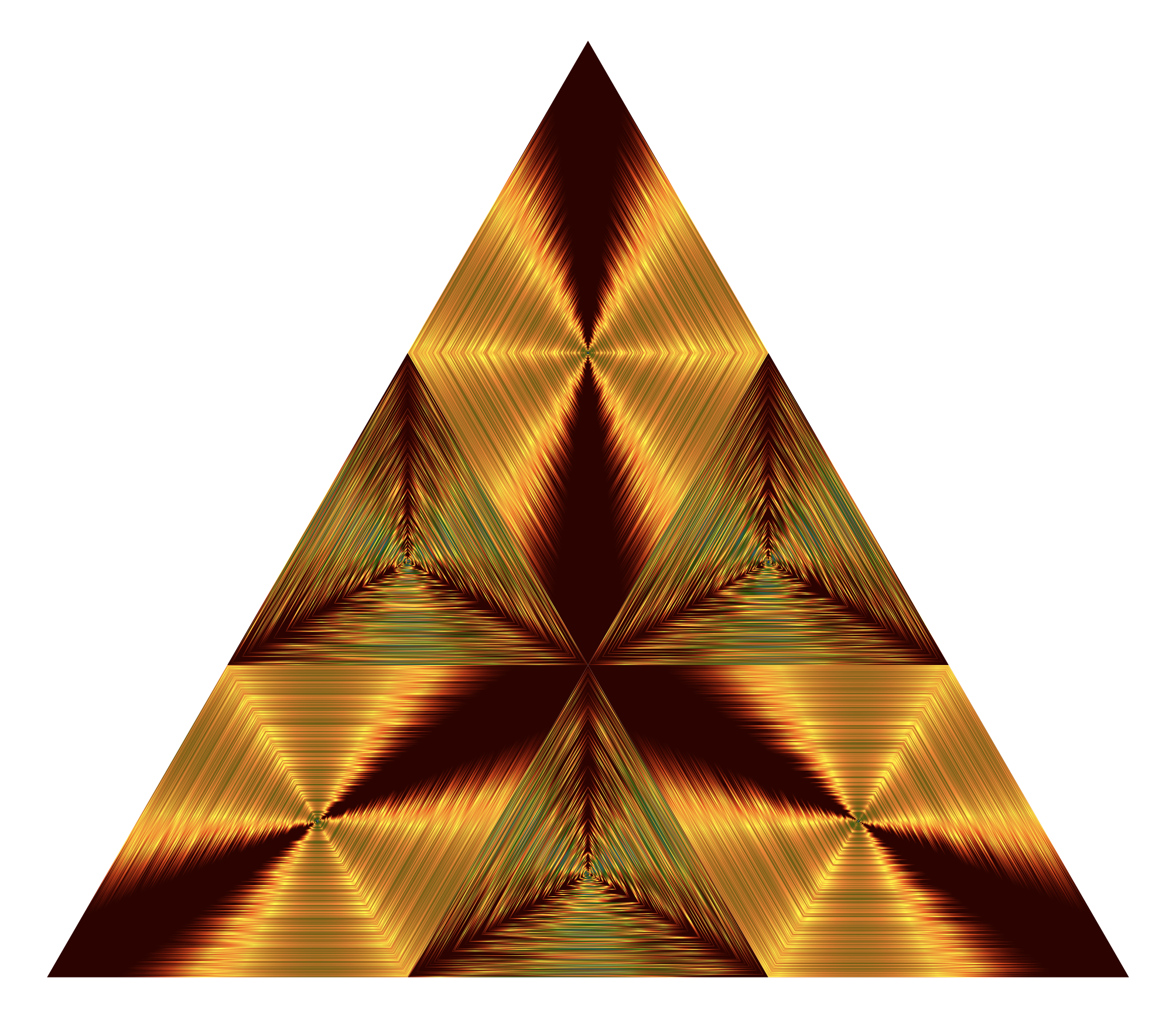This features a large, golden triangle with rays passing through it. This unique design gives the impression of light shining through the triangle, creating an interesting visual effect. The triangle is made up of several smaller triangles that are arranged in such a way as to create a larger, more complex shape. The overall appearance of the image is quite striking and eye-catching due to its vibrant colors and intricate design.