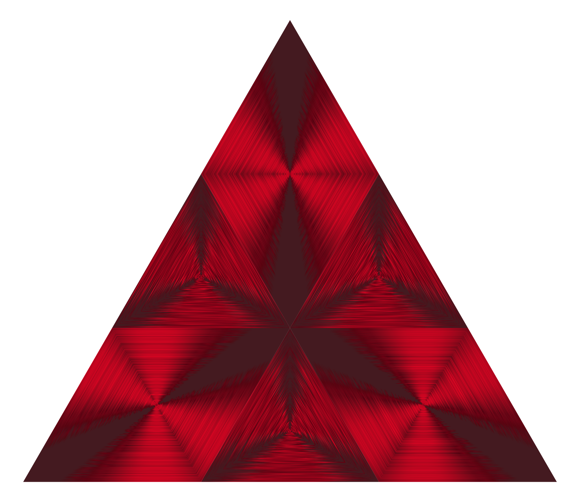 This features a red triangle with a unique design, resembling a diamond. It is composed of many smaller triangles arranged in an intricate pattern that creates the illusion of depth and complexity. The red color of the triangle stands out against a white background, making it visually striking. This artistic piece could be used as a decorative element or even as a symbol for various concepts such as unity, strength, or creativity.