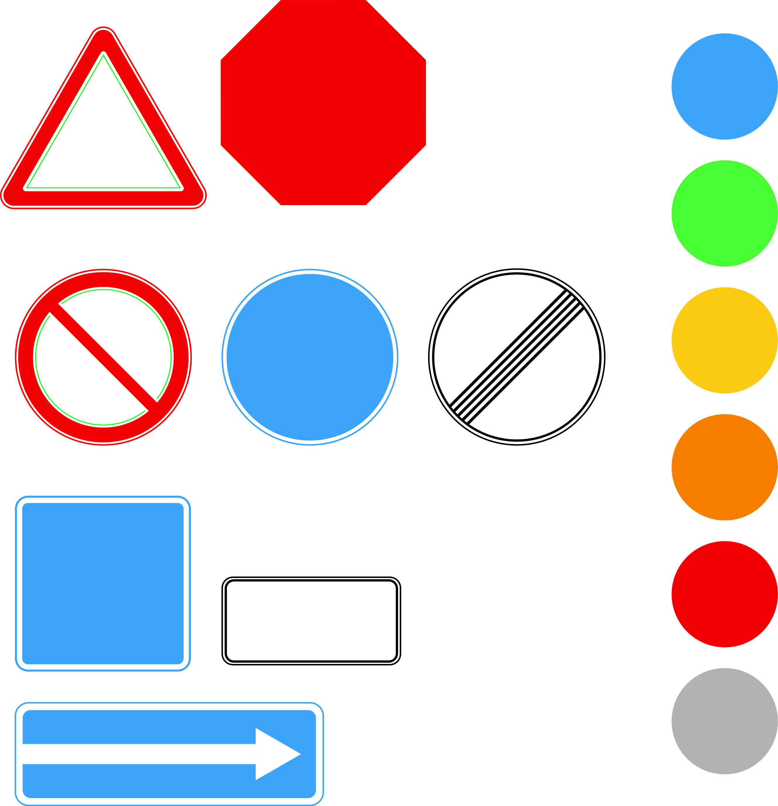 This features a collection of various road signs in different shapes and colors. These signs are displayed on a white background, making them stand out clearly. There is an assortment of triangles, circles, squares, and other geometric shapes that make up the diverse group of signs. Some of these signs have specific meanings or functions, while others may be more general in nature. The arrangement of these signs creates a visually appealing display, showcasing their unique designs and colors.