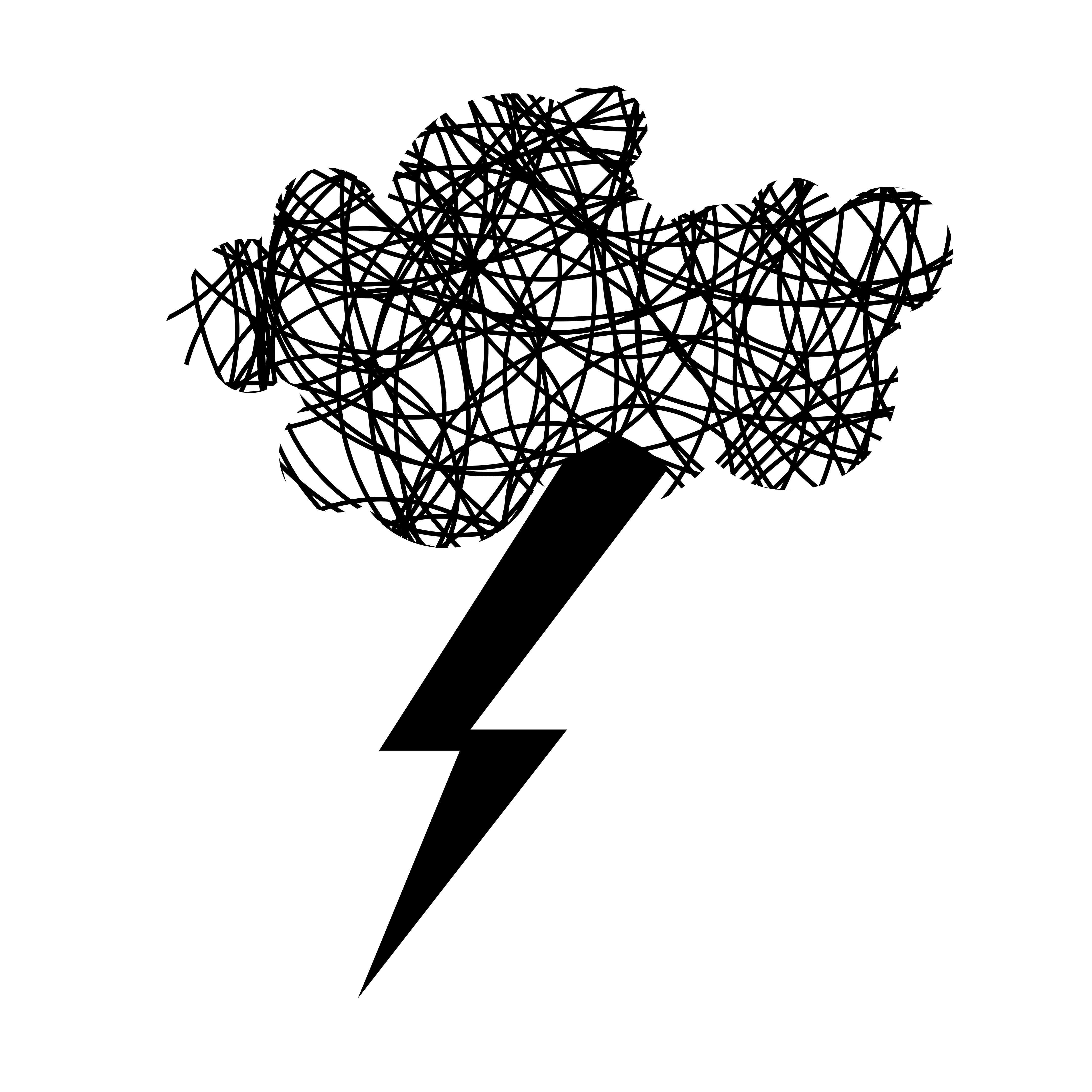 This features a black and white cloud with a black lightning bolt descending from it. This striking visual is created by the interplay of light and shadow, as well as the contrasting colors of the cloud and the lightning bolt. The cloud appears to be made up of many small lines, giving it a textured appearance. The lightning bolt, on the other hand, has a more uniform shape, with its bold black color standing out against the white background of the cloud. This striking image captures the power and beauty of nature's elements in motion.