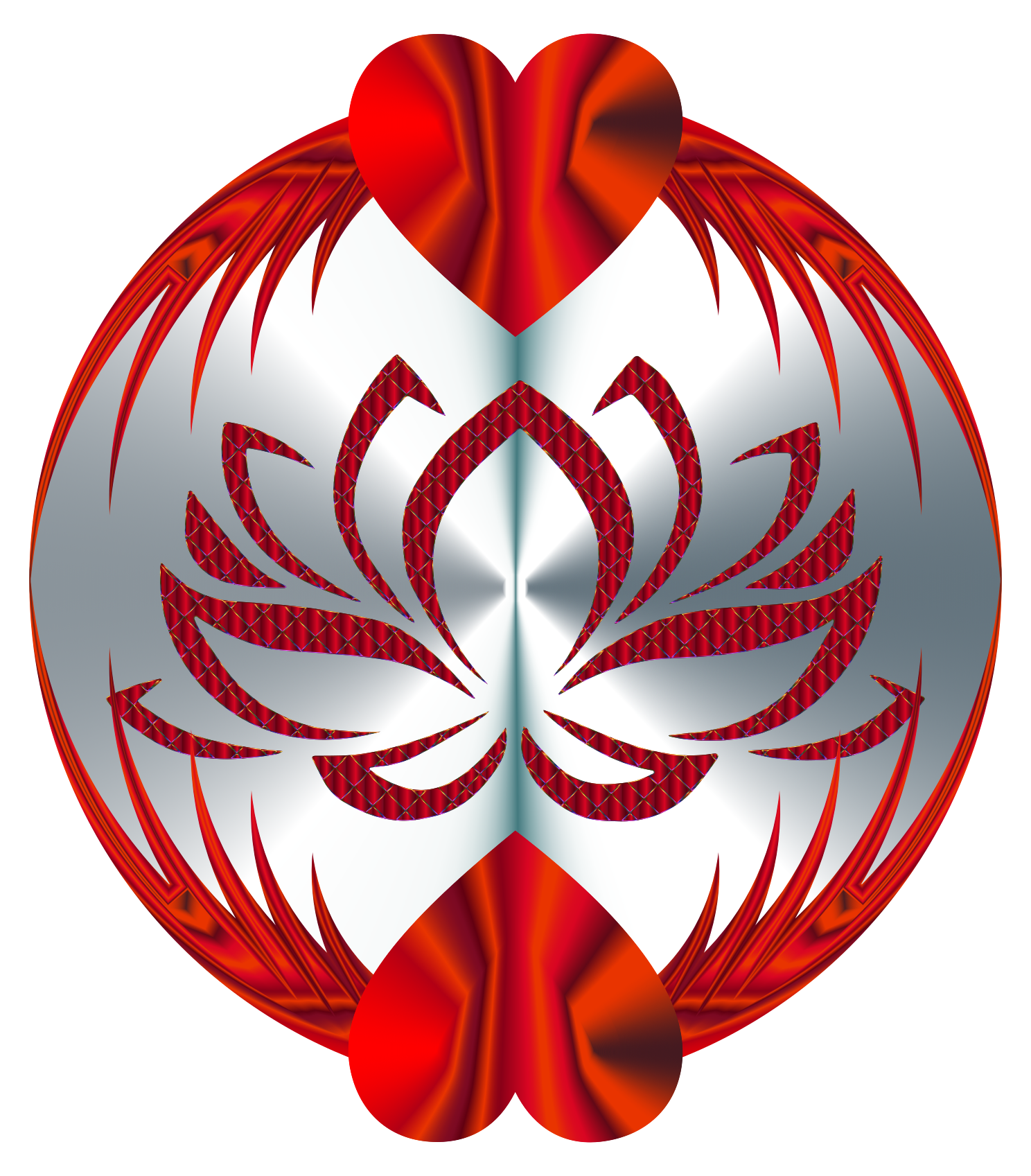 This features a shiny, silver and red ornament with two hearts on it. In the center of the ornament is a red lotus design that adds to its visual appeal. This unique piece of artwork showcases an intricate blend of colors and patterns, making it an eye-catching decoration for any space. The combination of silver and red creates a striking contrast against each other, enhancing the overall beauty of the ornament.