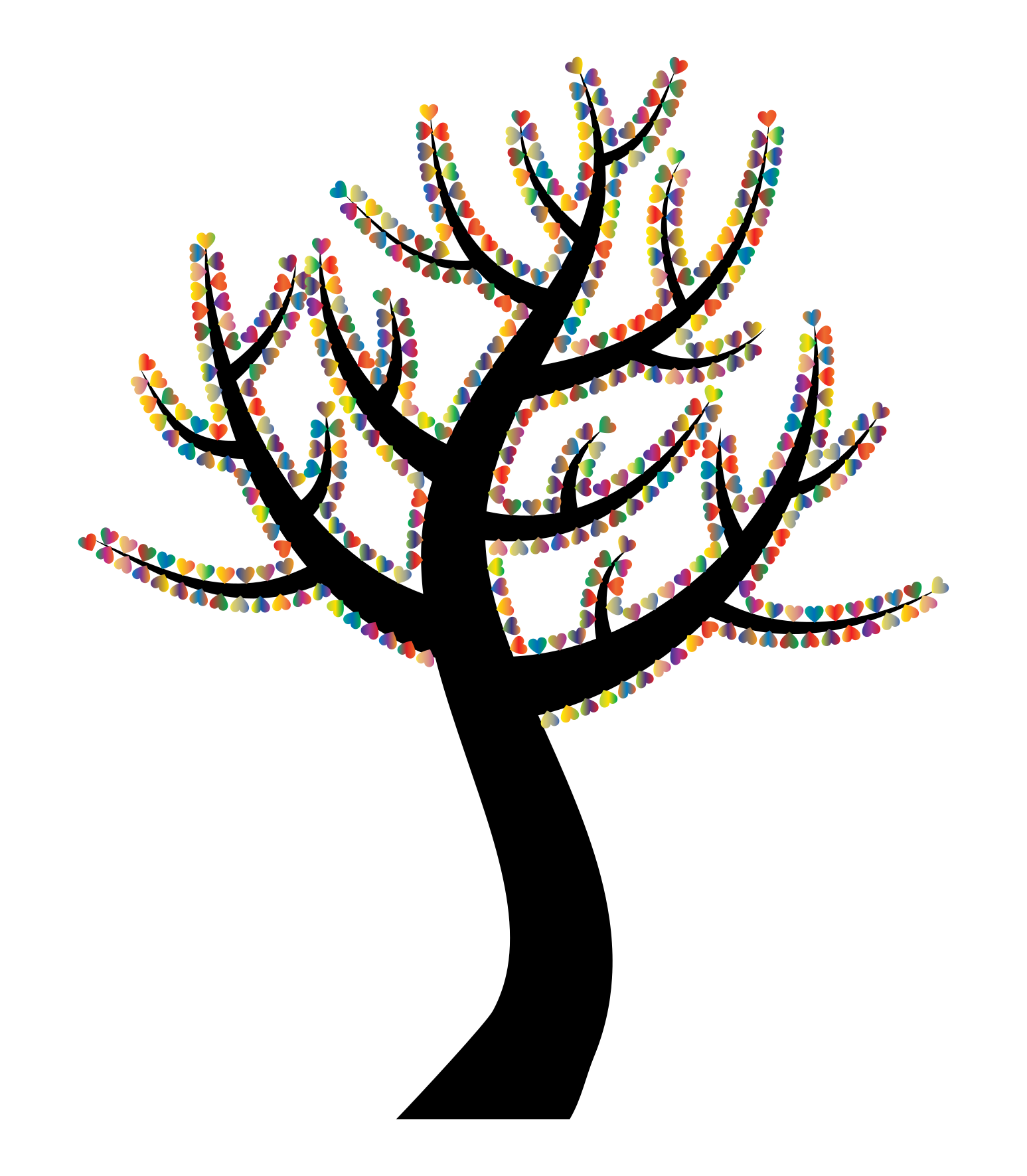 This features a black and white tree with a curved stem, adorned with small hearts. These hearts come in various colors, adding a vibrant touch to the overall appearance of the tree. The tree is surrounded by a white background, which further emphasizes its unique design. This creative representation of a tree showcases both its natural beauty and the playful addition of colorful hearts.