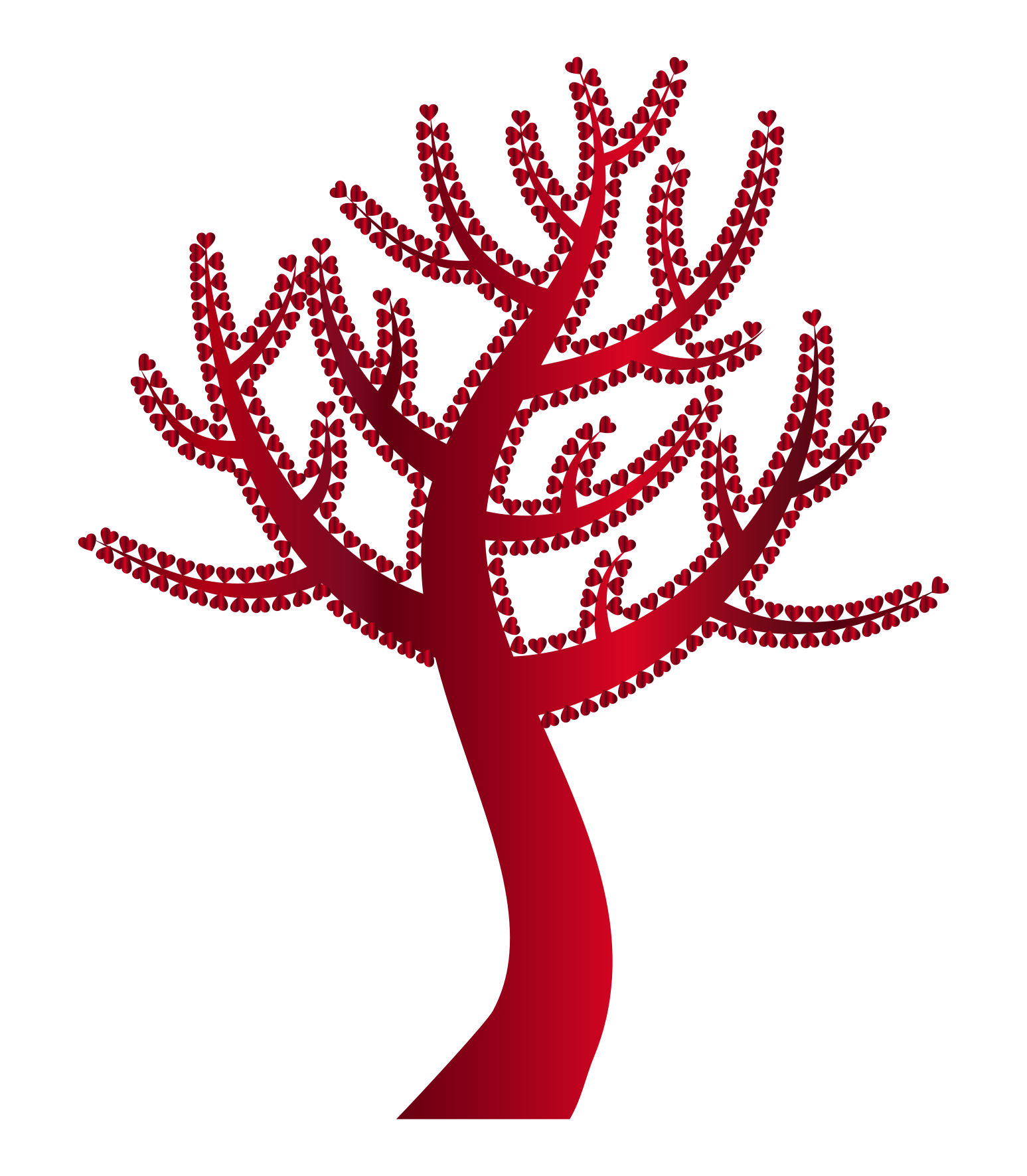 This features a red tree with hearts instead of leaves. It is an artistic representation, as the tree appears to be made up of hearts rather than branches and leaves. The tree's trunk is prominently visible in the foreground, while its heart-shaped leaves are scattered throughout the scene. This unique design creates a visually appealing and imaginative interpretation of a tree.