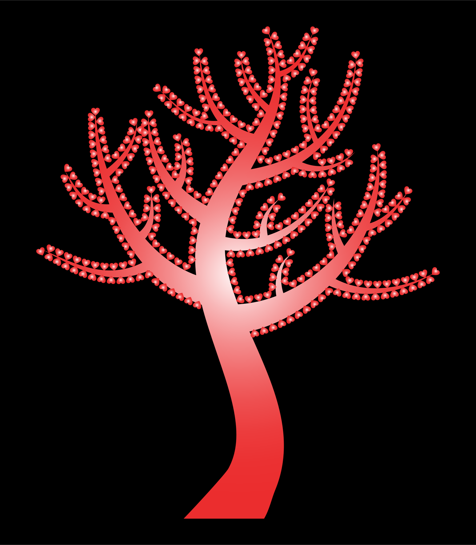 This features a red tree with many branches, creating an artistic and visually appealing scene. The tree is adorned with numerous hearts scattered throughout its branches, adding a touch of whimsy to the overall design. The hearts come in various sizes and are positioned at different heights on the tree, giving it a dynamic and lively appearance. This unique tree design could be used as an interesting decoration or even as a symbol for love and affection.