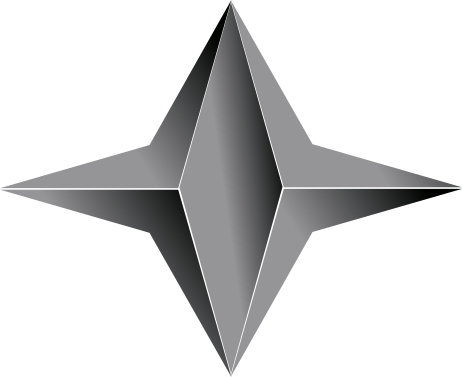 This features a silver star with a dark background. The star is made up of four triangular shapes, each one slightly overlapping the other. The overall appearance gives it an interesting and unique look. This design could be used for various purposes such as decoration or even in a logo.