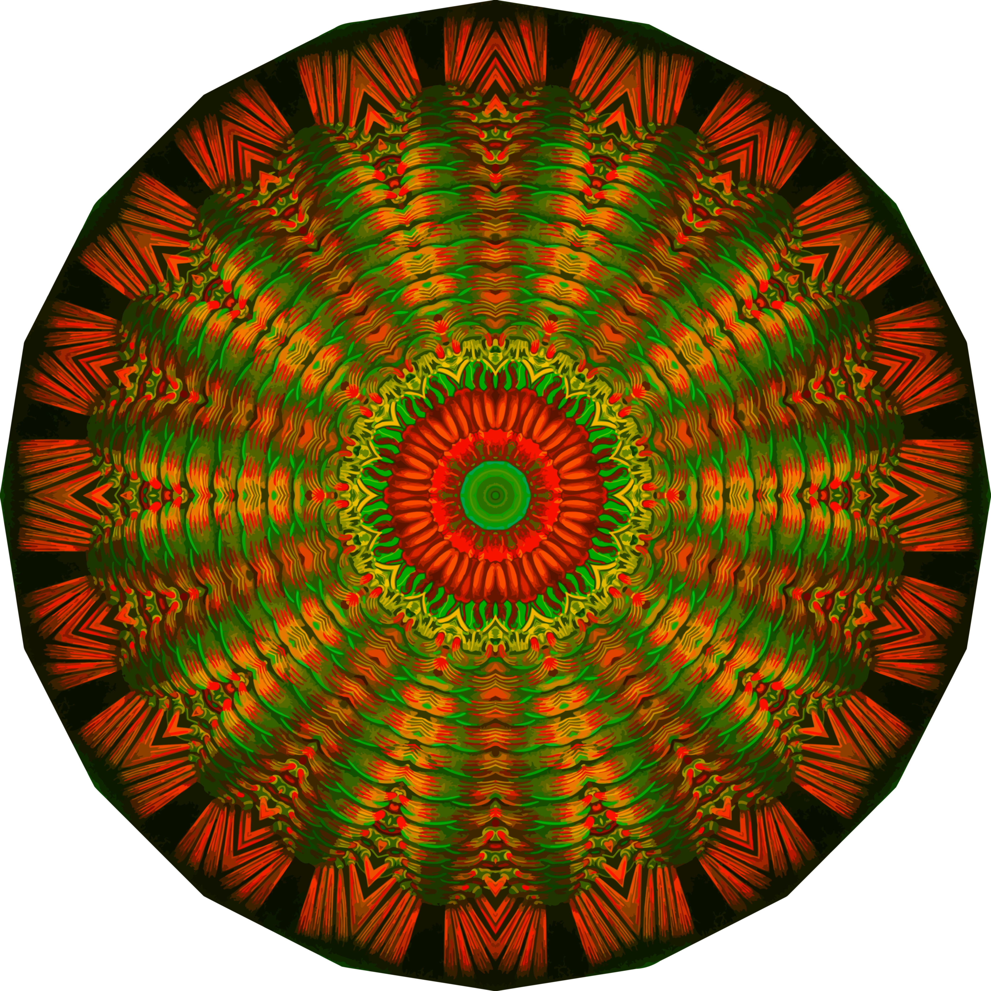 This features a large, colorful circular design with an intricate pattern. The design is made up of many small circles arranged in a circular formation, creating a visually striking and complex pattern. The colors used in the design are predominantly red and green, giving it a vibrant and lively appearance. This artistic piece could be a decorative item or an interesting visual element for various applications such as wallpaper, fabric patterns, or even digital designs.