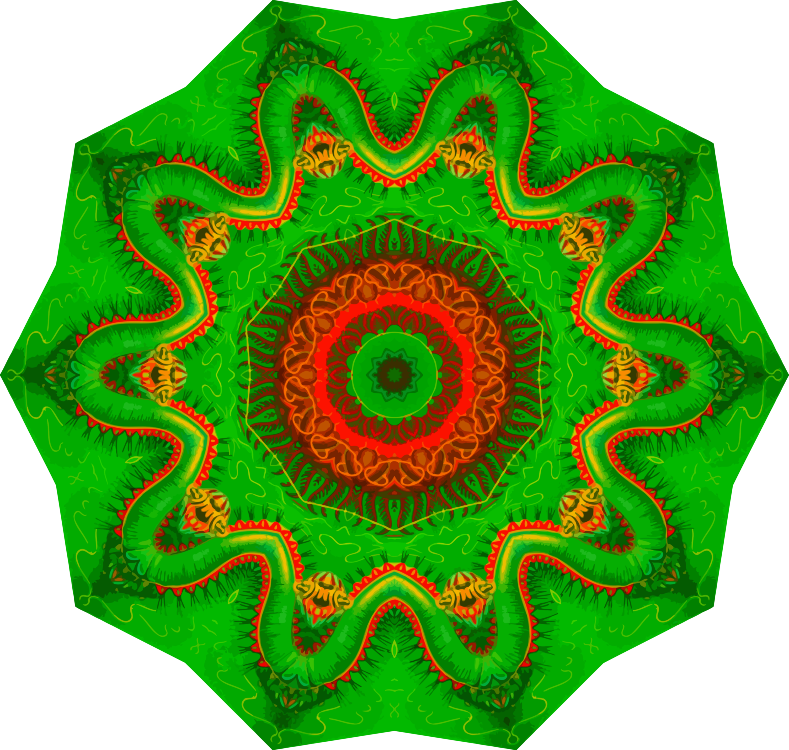This features a large, colorful umbrella with an intricate design on it. The umbrella is green and red in color, and the design resembles a worm or a similar creature. The pattern is created by repeating wedges of the drawing around a central point, giving the impression of rotational symmetry. This unique design adds visual interest to the umbrella, making it stand out as an eye-catching piece.