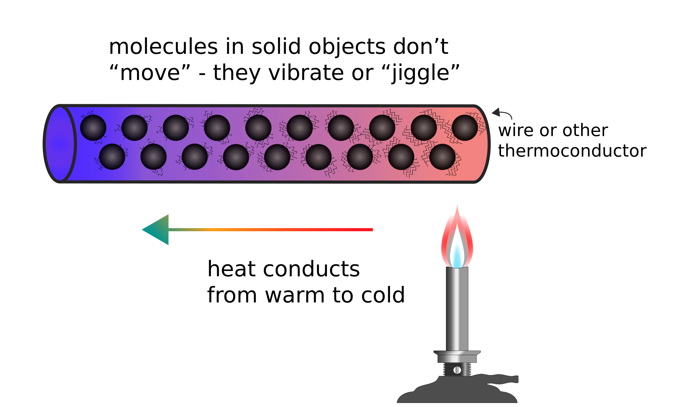 This depicts a conceptual representation of molecules in solid objects. It is explained that these objects do not move, vibrate or jiggle. The image also shows the relationship between heat conductors and warmth from a candle flame. The text on the image explains how heat conductors can transfer warmth from a warm source to a cold one, such as a candle flame. This concept is illustrated with an arrow pointing towards the left side of the image, indicating the direction of heat transfer.