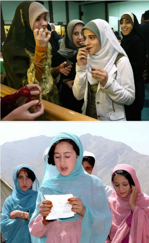 This features a group of women gathered together, with some wearing headscarves. They are standing in front of a building and appear to be engaged in conversation or enjoying each other's company. Among the group, there is a young girl holding a piece of paper, possibly showing something interesting to her friends. The scene captures various expressions and interactions among the women, creating a lively atmosphere.
