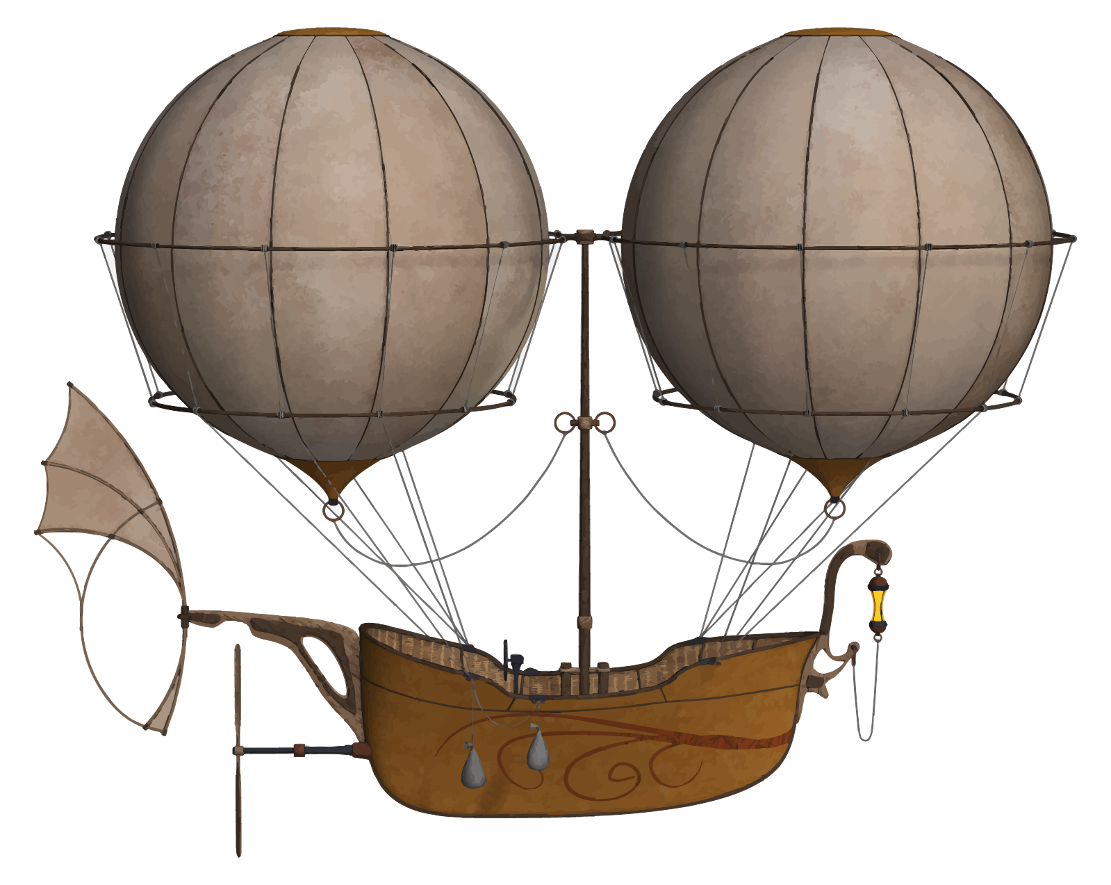 This features a large, old airship with two massive balloons attached to it. These balloons are connected by chains and appear to be the main focus of the ship's design. The airship is made up of wood and has an intricate detailing on its side. There are also several smaller balloons scattered around the main ones, adding to the overall visual appeal of the scene.