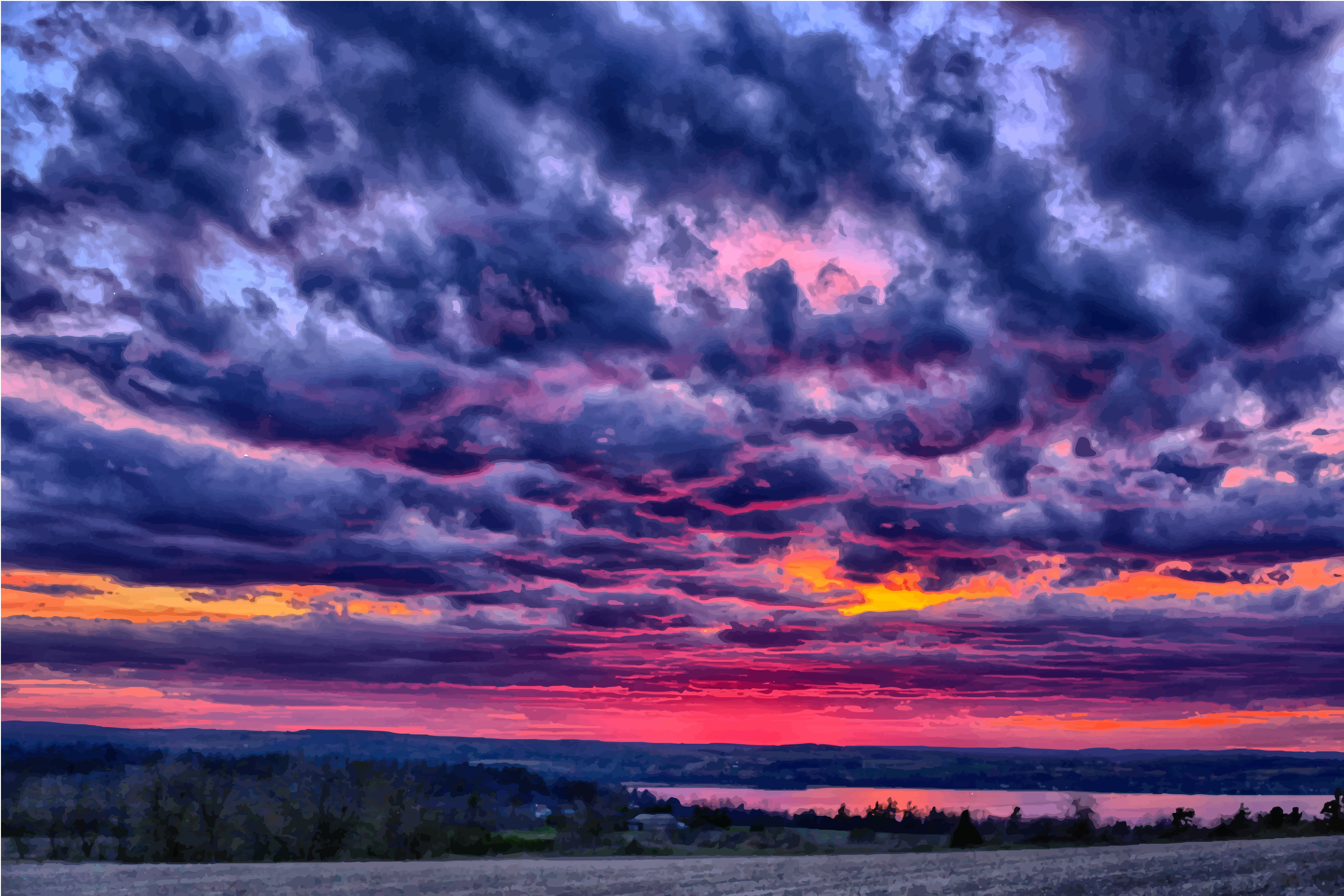 This captures a beautiful sunset over a large body of water, with the sky filled with clouds. The clouds are scattered throughout the scene, creating an atmospheric backdrop for the setting sun. The sun is low in the sky, casting its warm hues across the landscape and reflecting off the water's surface. In the distance, there are trees that add to the serene atmosphere of the scene. This picturesque view evokes a sense of tranquility and peacefulness as one takes in the breathtaking beauty of nature.