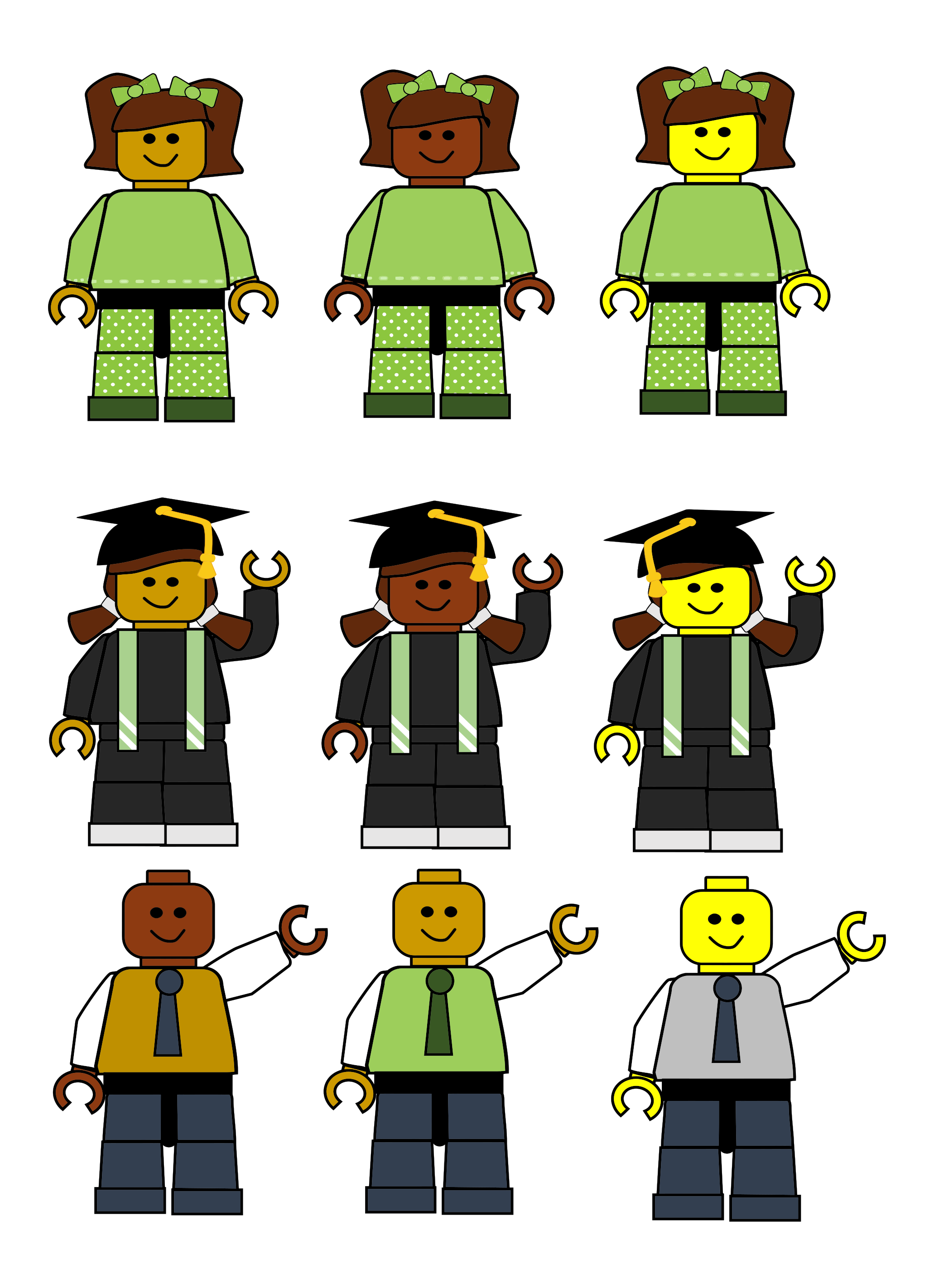 This features a collection of nine different Lego figures, each dressed in various outfits. There are three green figures at the top, followed by three graduate outfits in the middle, and finally, three office outfits at the bottom. Each figure is posed with their hands raised, giving the impression that they are waving or greeting someone. The Lego figures are arranged in a row, showcasing each unique outfit and design.