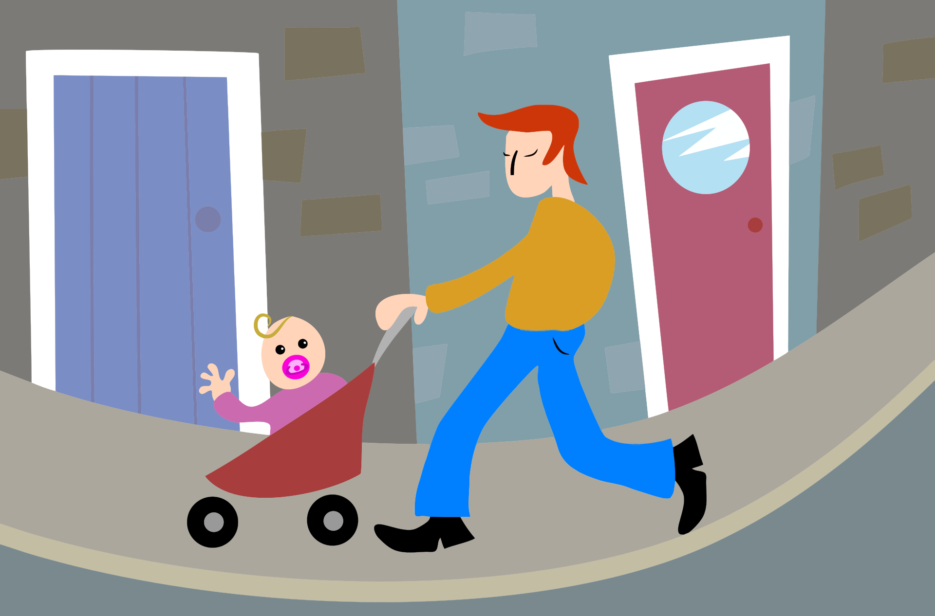 This features a man walking down the street while pushing a baby in a stroller. The man is wearing blue jeans and appears to be enjoying his time with the child. In addition to the man and the baby, there are two other people visible in the scene, one on the left side of the image and another further back on the right side. The street itself has a few elements that add character to the scene. There is a clock mounted on the wall near the top-left corner of the image, and a bottle can be seen placed on the ground in the middle of the scene. The overall atmosphere suggests a casual, everyday moment shared between the man and his child as they walk down the street together.