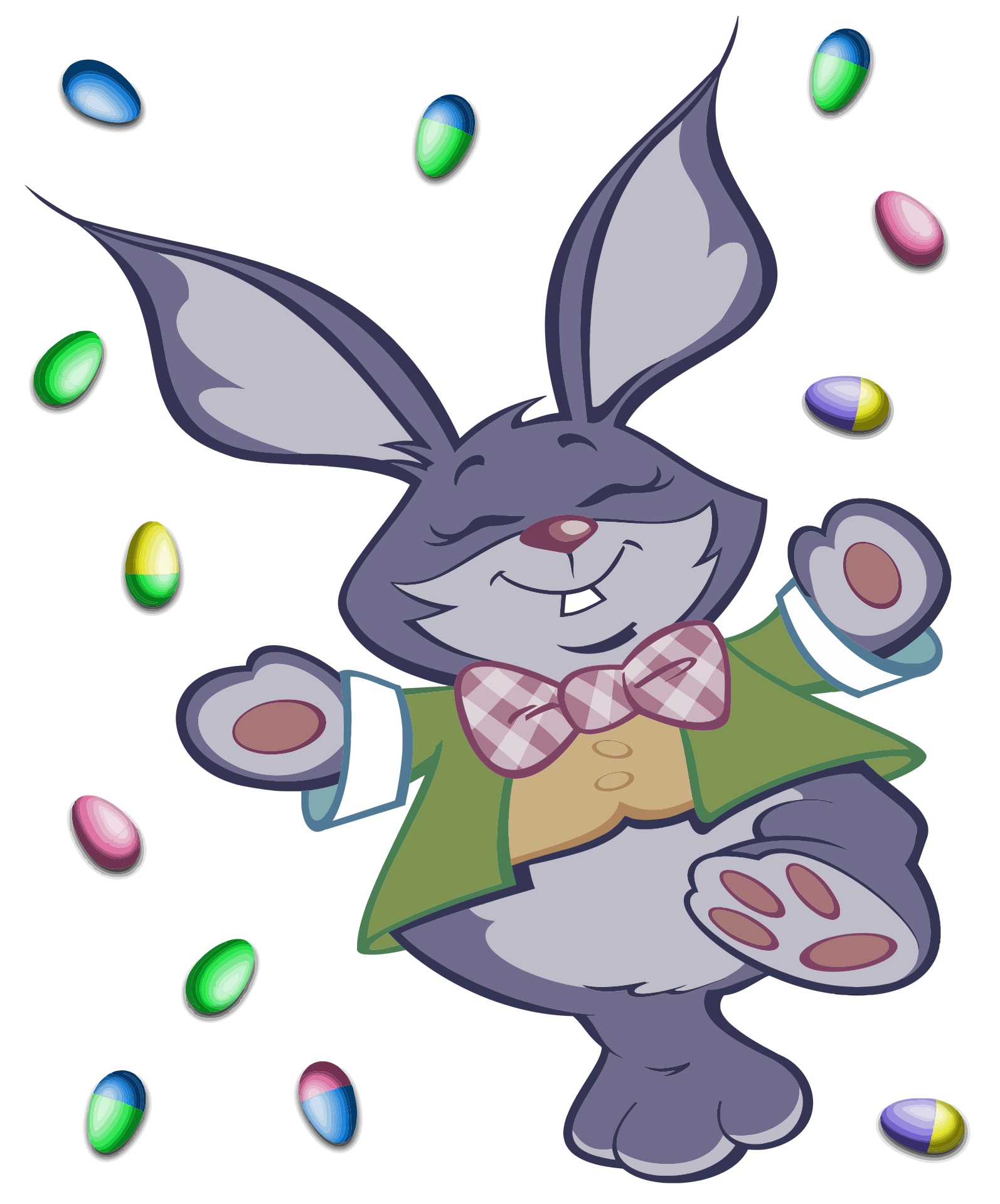 This features a cute cartoon bunny wearing a green jacket and bow tie, with a yellow vest underneath. It is posing for the camera while surrounded by colorful eggs that are falling around it. There are several different colored eggs scattered throughout the scene, adding to the playful atmosphere of the image. The bunny appears to be enjoying its time as it stands in front of these vibrant and lively objects.