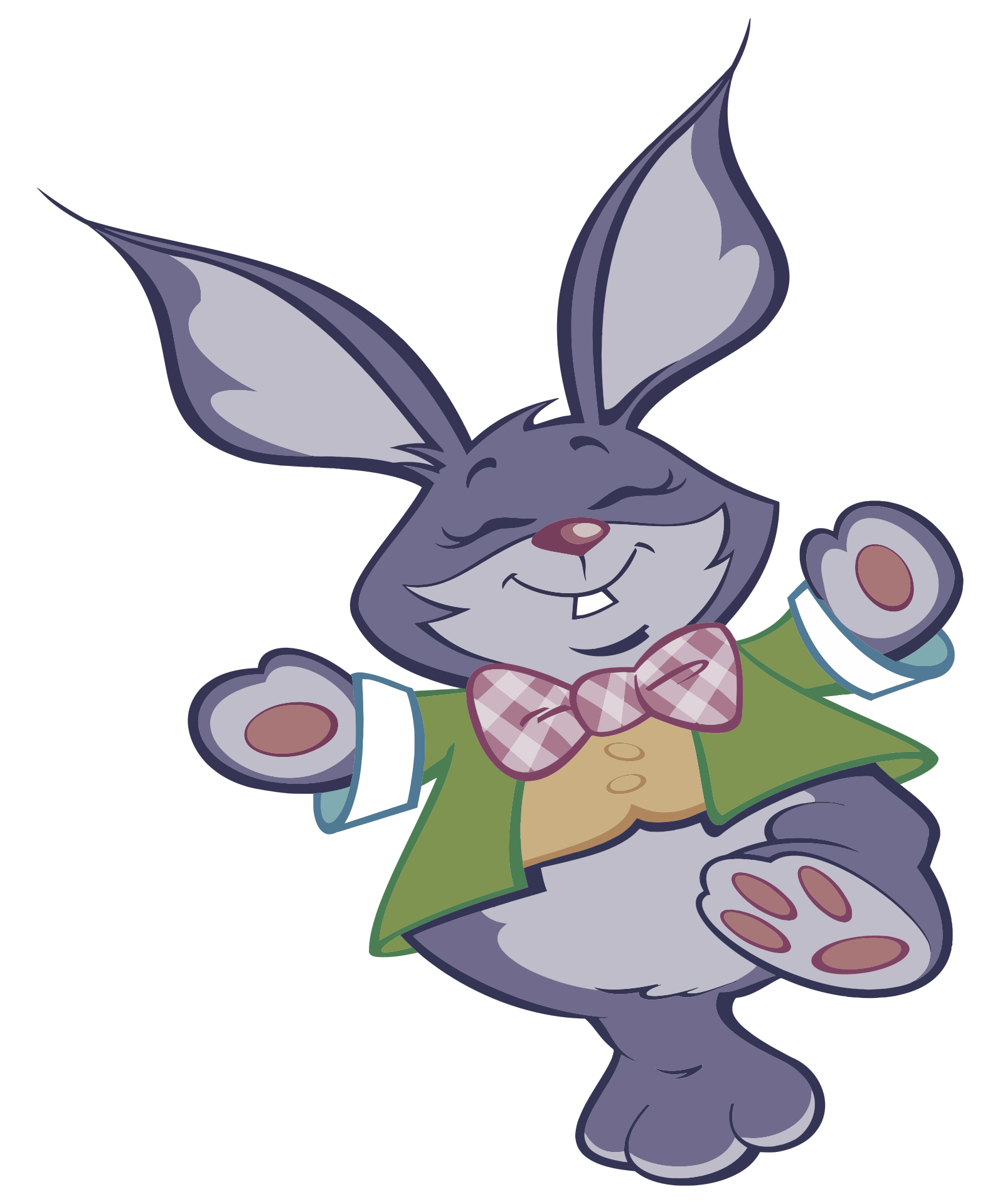 This features a cartoon bunny rabbit wearing a green jacket and bow tie. It appears to be dancing or performing some sort of action, as it is holding its hands out in front of itself. The bunny's facial expression seems to convey a sense of playfulness and joy. The overall scene has a whimsical and lighthearted atmosphere, with the cartoon rabbit being the main focus of the image.
