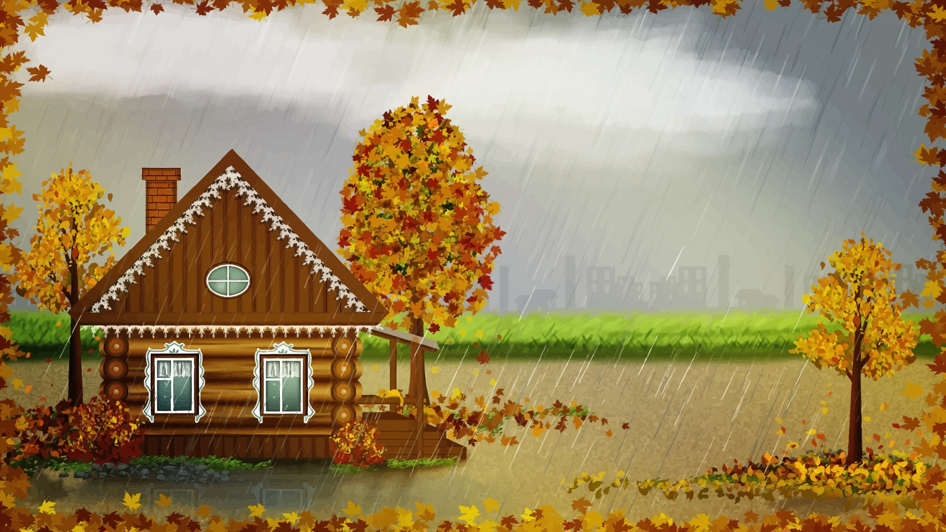 This features a cozy cabin nestled in the middle of a forest, surrounded by trees. It is a beautiful autumn scene with rain falling down, creating a serene atmosphere. The cabin itself is made out of wood and has a rustic charm to it. There are three trees visible in the picture, one on the left side, another in the center, and the third on the right side. The combination of the cabin, the forest, and the falling rain creates an idyllic and picturesque setting.
