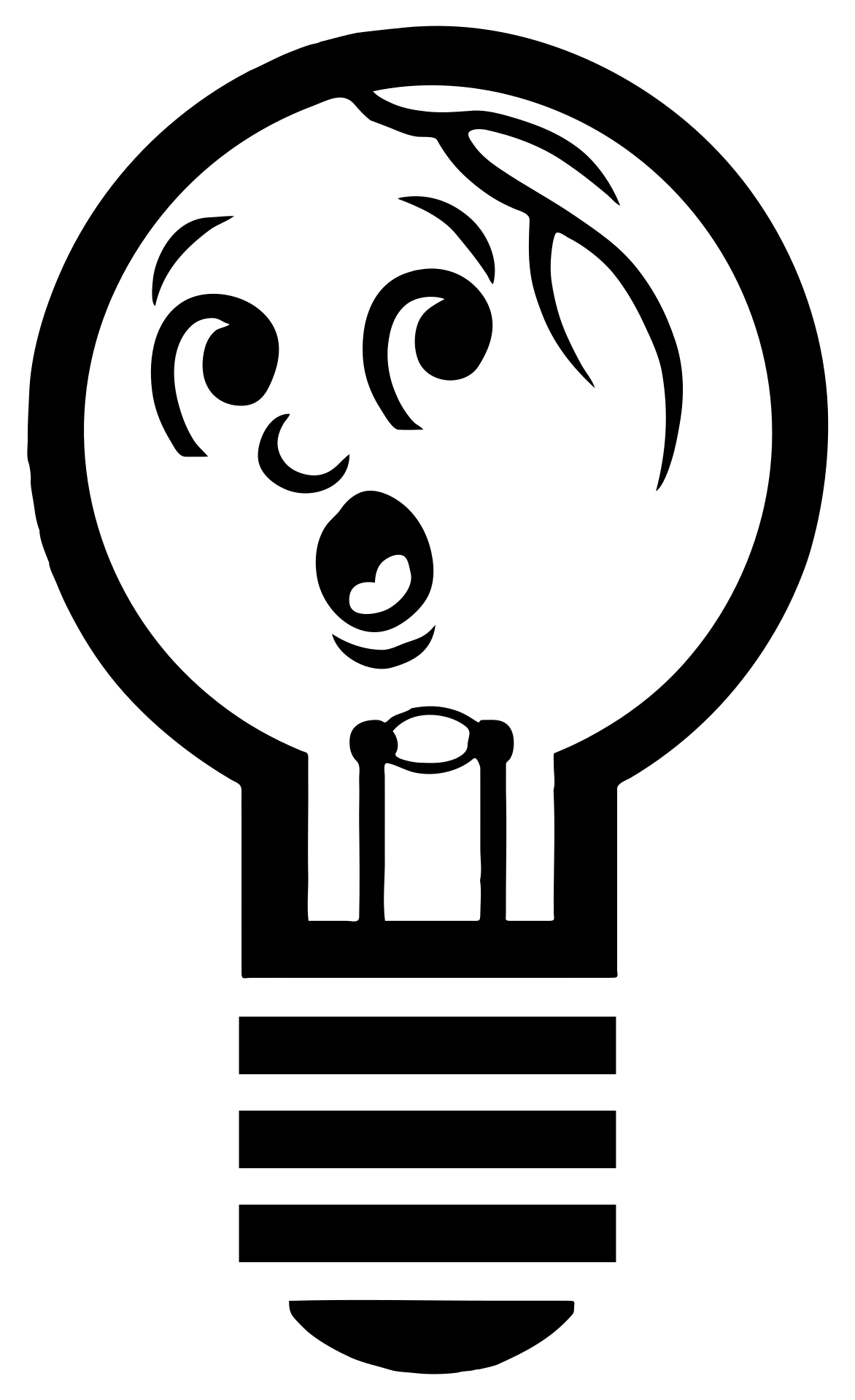 This features a cartoon-like light bulb with a face drawn on it. The light bulb has a mouth open, giving the impression that it is talking or making a sound. This whimsical design adds a playful touch to the otherwise ordinary object. The light bulb appears to be black and white in color, which further emphasizes its unique appearance.