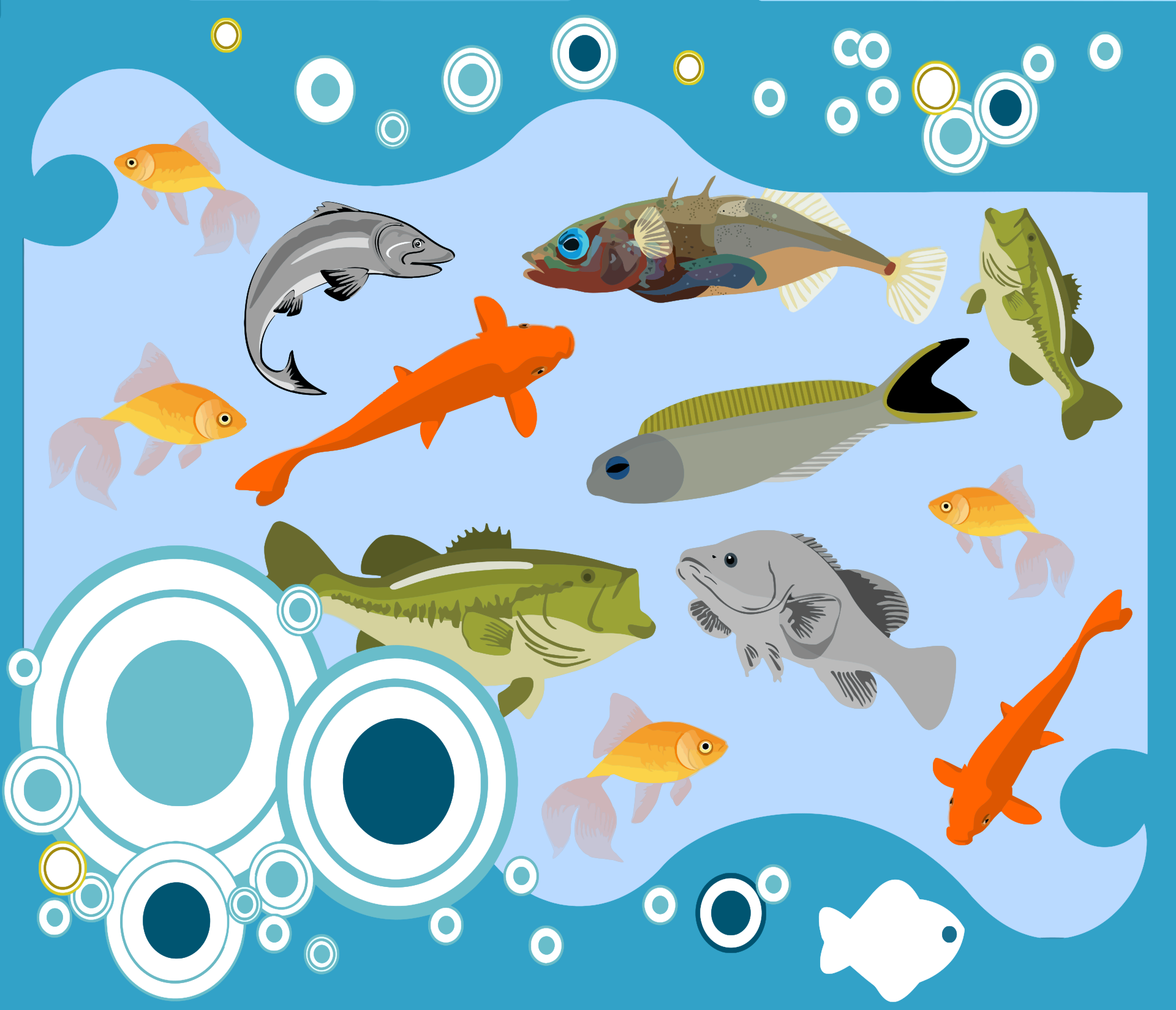 This features a colorful underwater scene with various fish and sea creatures. There are several different types of fish, including some that resemble sharks, swimming in the water. Some of these fish have fins sticking out from their bodies, adding to the diversity of the aquatic life displayed. In addition to the fish, there is a crab visible among the sea creatures. The scene appears to be set underwater, with the fish and other animals swimming around in a lively environment. Overall, it's an engaging and vibrant image that captures the beauty of marine life.