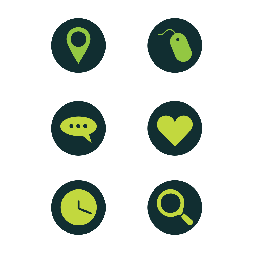 This features a collection of six circular icons, each with a different design. These icons are all dark blue in color and have green pictures within them. They appear to be arranged in a row or grid formation, making it easy for the viewer to identify each icon's purpose. The icons may represent various functions or symbols, such as a clock, a heart, a computer mouse, a search bar, and a map. These icons are likely used on a website or application to provide users with quick access to different features or tools.