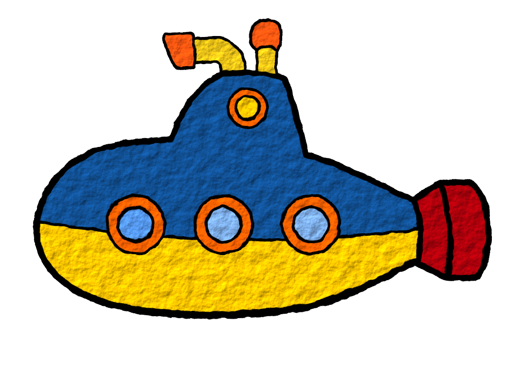This features a colorful cartoon submarine with a yellow and blue body. It has three windows on the middle section, adding to its playful appearance. The submarine is depicted in a close-up view, allowing for a detailed look at its design. This whimsical illustration could be used as an artistic representation of a child's imagination or as a decorative element in a children's room or play area.