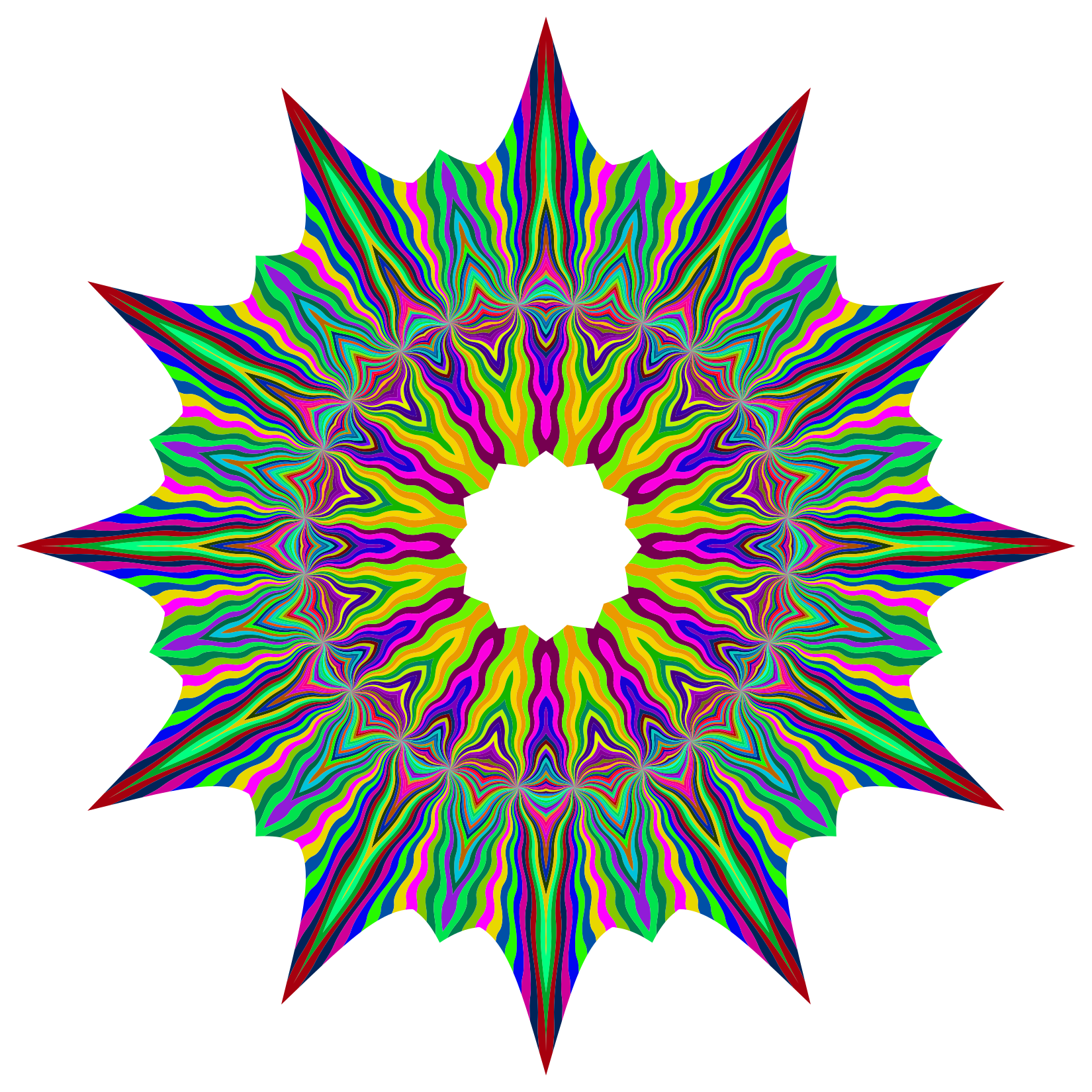 This features a large, colorful, and intricate design that resembles a flower. The flower has many sharp petals surrounding the center, which is filled with bright colors. The entire design is composed of various shapes and colors, creating an eye-catching and vibrant pattern. This artistic piece could be used as a decorative element or even as a wallpaper to add a touch of creativity and visual interest to any space.