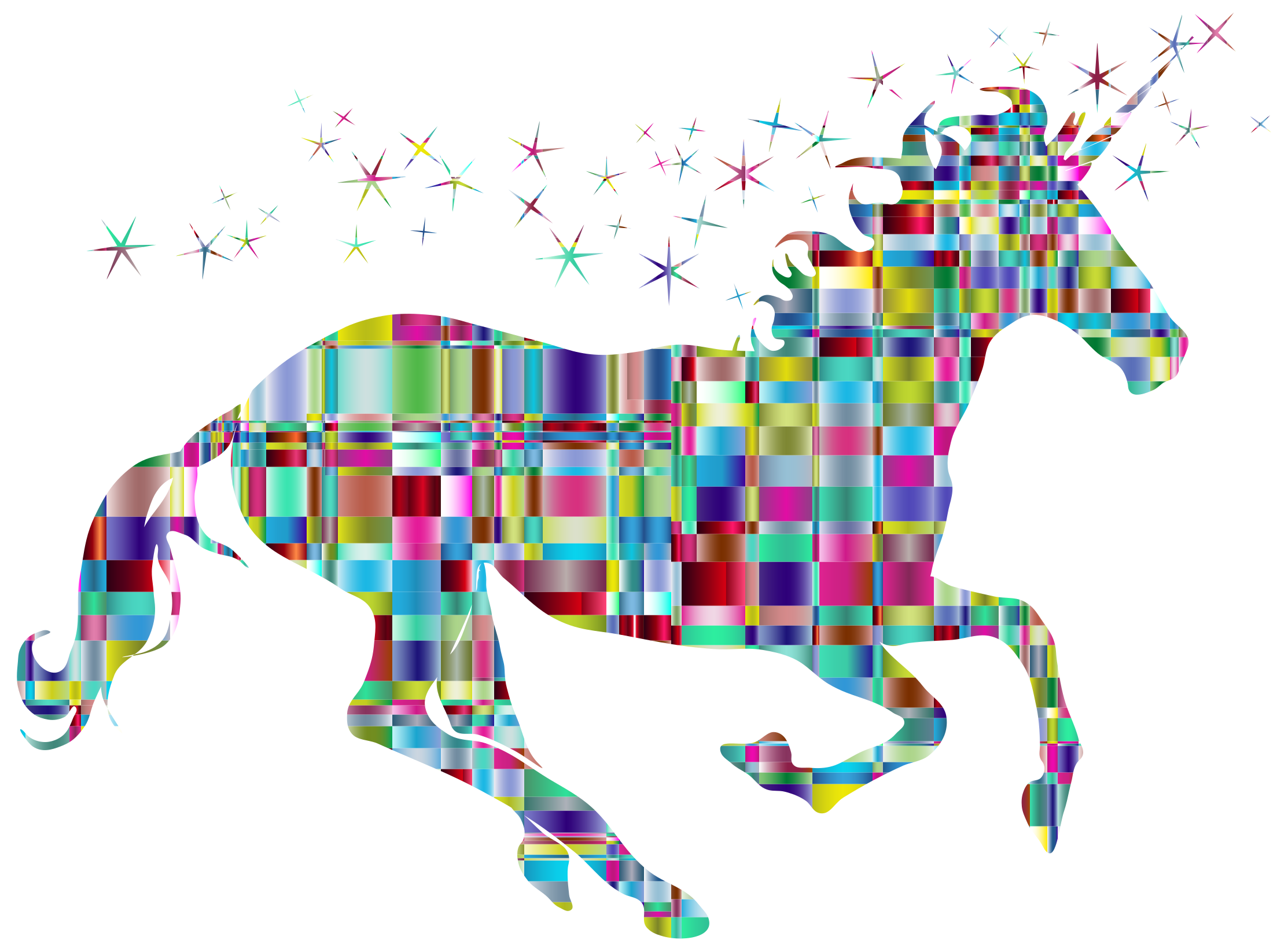 This features a colorful horse with a rainbow mane and tail, flying through the air. The horse is surrounded by a multitude of stars in various colors, creating an eye-catching scene. The horse's body is predominantly white, while its mane and tail are vibrant shades of pink, blue, yellow, green, and orange. The stars surrounding the horse add to the lively atmosphere of the image, making it a visually appealing piece of artwork.