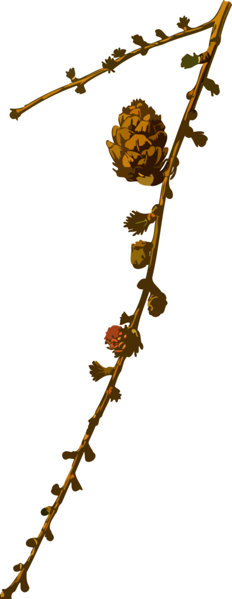 This features a close-up of a branch with small flowers on it. The branch is positioned in the foreground, and there are several pine cones scattered throughout the scene. These pine cones vary in size and can be found at different positions along the branch. The overall composition creates an interesting visual focusing on the delicate details of the flower-covered branch.