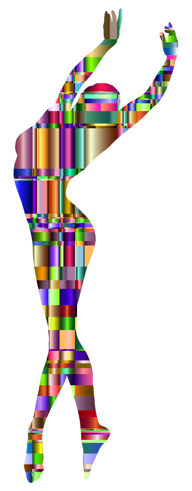 This features a colorful, abstract representation of a woman in motion. She is captured mid-leap, with her arms raised above her head and legs off the ground. This artistic depiction showcases the dynamic nature of dance and the fluidity of movement. The vibrant colors used to create this image add an energetic and lively atmosphere to the scene.