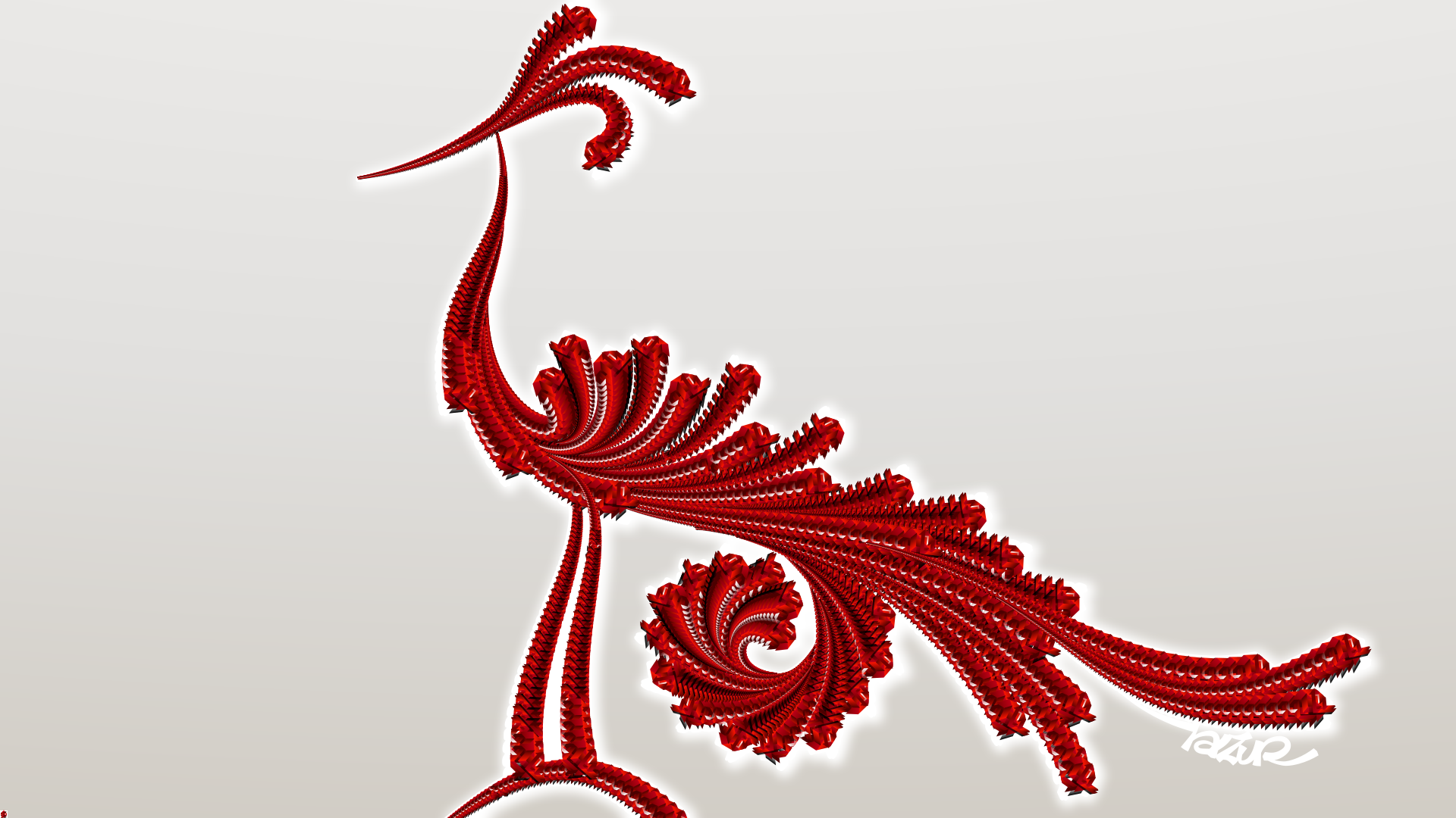 This features a beautifully illustrated red bird with long feathers on its body. It appears to be standing in front of a light gray background, which adds contrast and depth to the scene. The bird's feathers are intricately detailed, showcasing the artist's skill and attention to detail. Overall, it is an eye-catching piece that captures the viewer's interest with its vibrant colors and artistic design.
